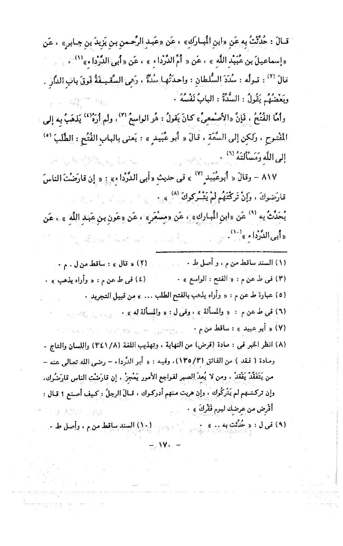 قال: حدثت به عن «ابن المبارك» , عن «عبد الرحمن بن يزيد بن جابر» , عن «إسماعيل بن عبيد الله» , عن «أم الدرداء» , عن «أبى الدرداء».