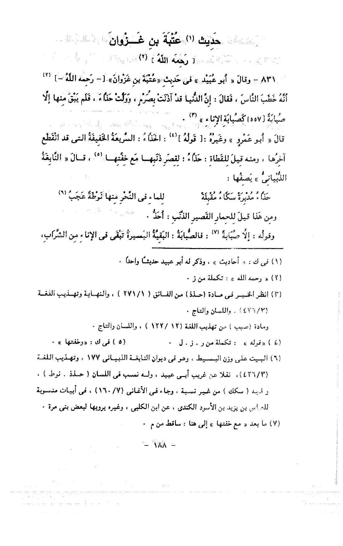 831 - وقال «أبو عبيد» في حديث «عتبة بن غزوان» [- رحمه الله -] أنه خطب الناس, فقال: إن الدنيا قد آذنت بصرم, وولت حذاء, فلم يبق منها إلا صبابة [557] كصبابة الإناء».