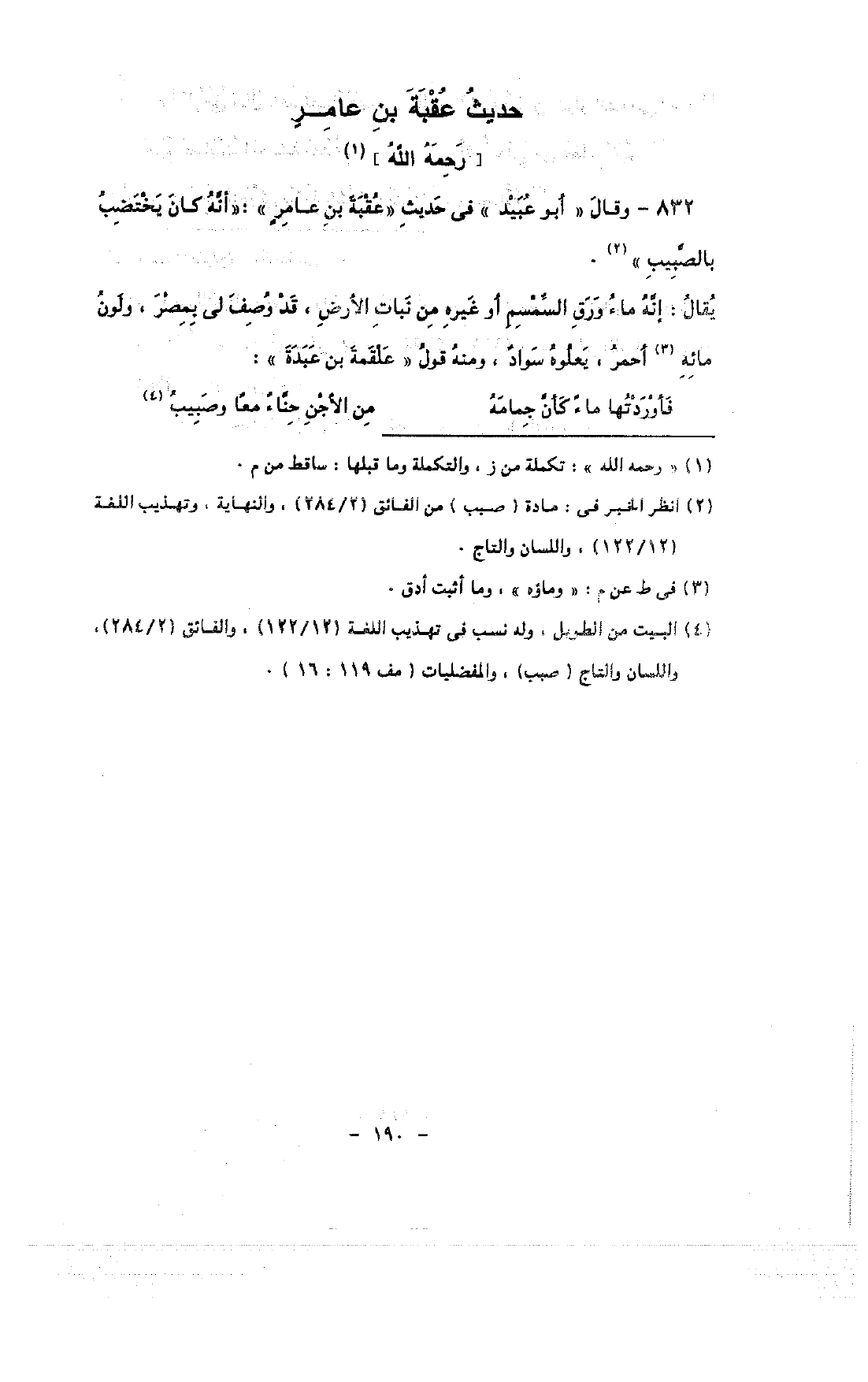 832 - وقال «أبو عبيد» في حديث «عقبة بن عامر»: «أنه كان يختضب بالصبيب».