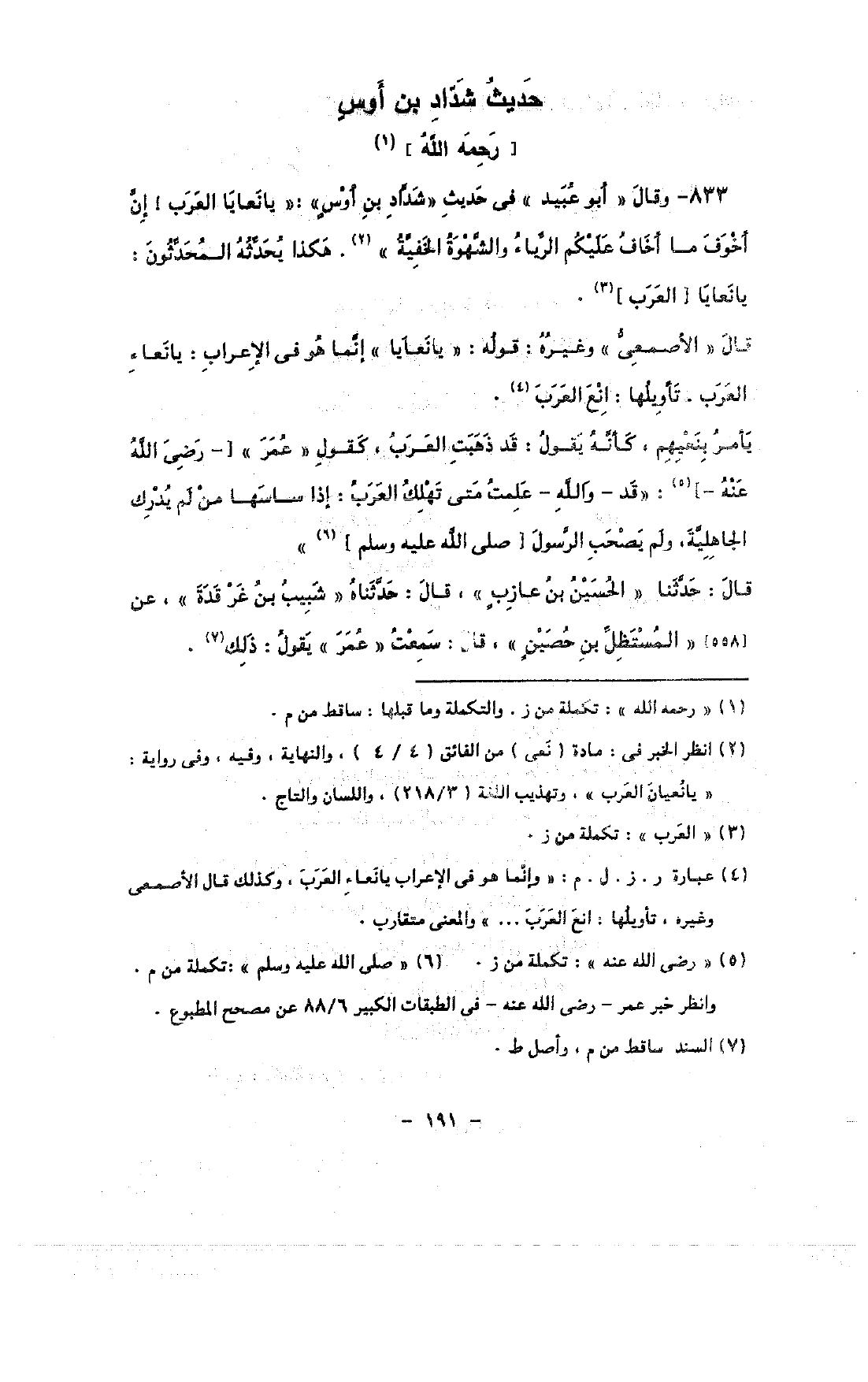 833 - وقال «أبو عبيد» في حديث «شداد بن أوس»: «يا نعايا العرب إن أخوف ما أخاف عليكم الرياء والشهوة الخفية». هكذا يحدثه المحدثون: يانعايا [العرب].