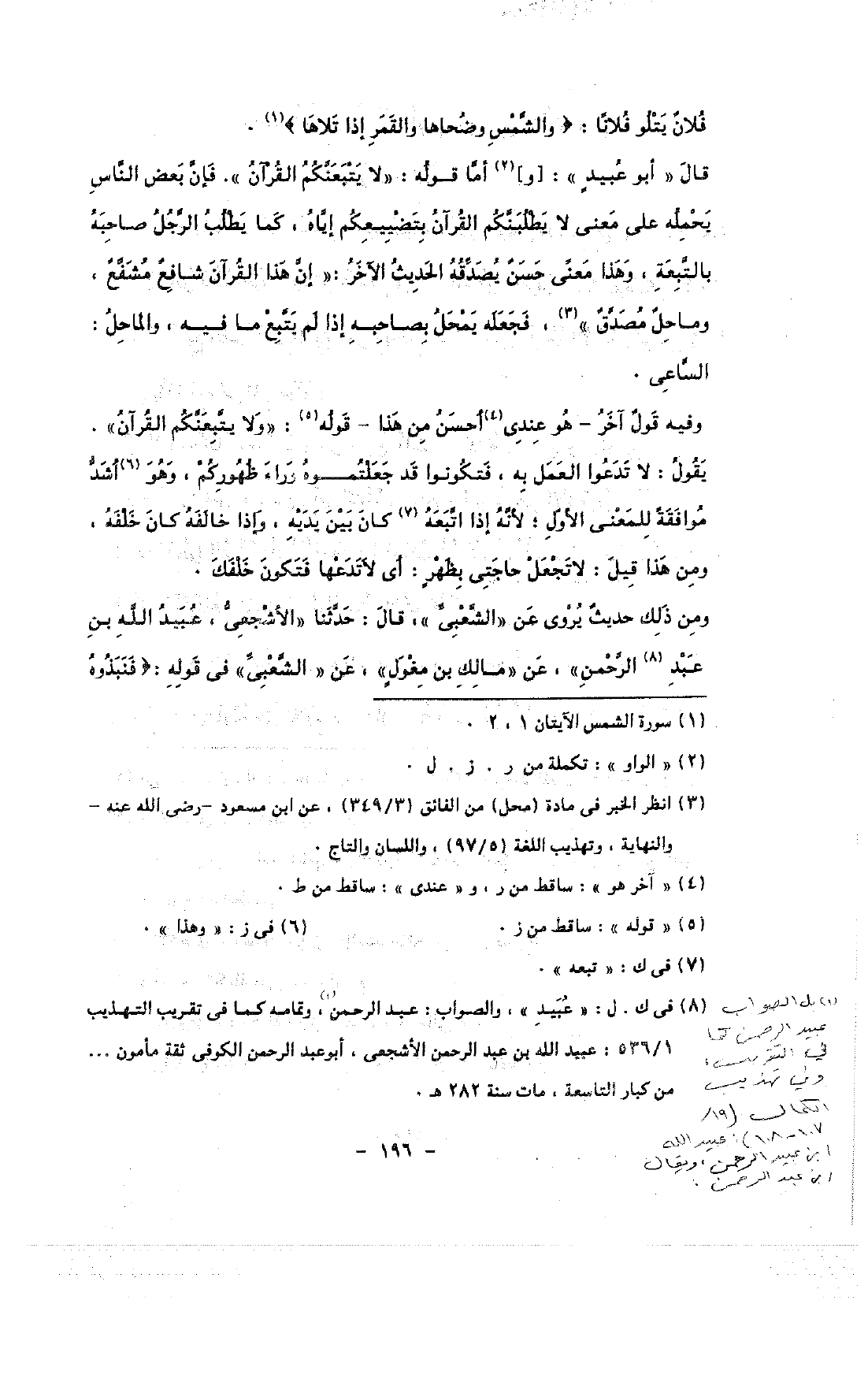 قال «أبو عبيد»: [و] أما قوله: «لا يتبعنكم القرآن». فإن بعض الناس يحمله على معنى لا يطلبنكم القرآن بتضييعكم إياه, كما يطلب الرجل صاحبه بالتبعة, وهذا معنى حسن يصدقه الحديث الآخر: «إن هذا القرآن شافع مشفع, وماحل مصدق» , فجعله بمحل يصاحبه إذا لم يتبع ما فيه, والماحل: الساعى.