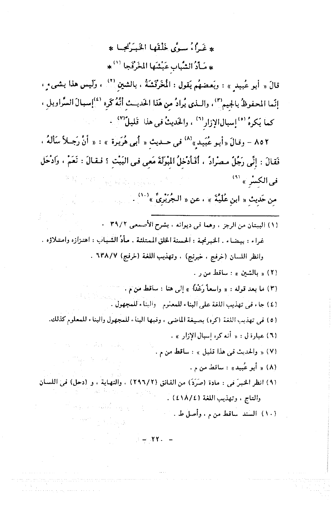قال «أبو عبيد»: وبعضهم يقول: المخرفشة, بالشين, وليس هذا بشئ, إنما المحفوظ بالجيم, والذى يراد من هذا الحديث أنه كره إسبال السراويل, كما يكره إسبال الإزار, والحديث في هذا قليل.