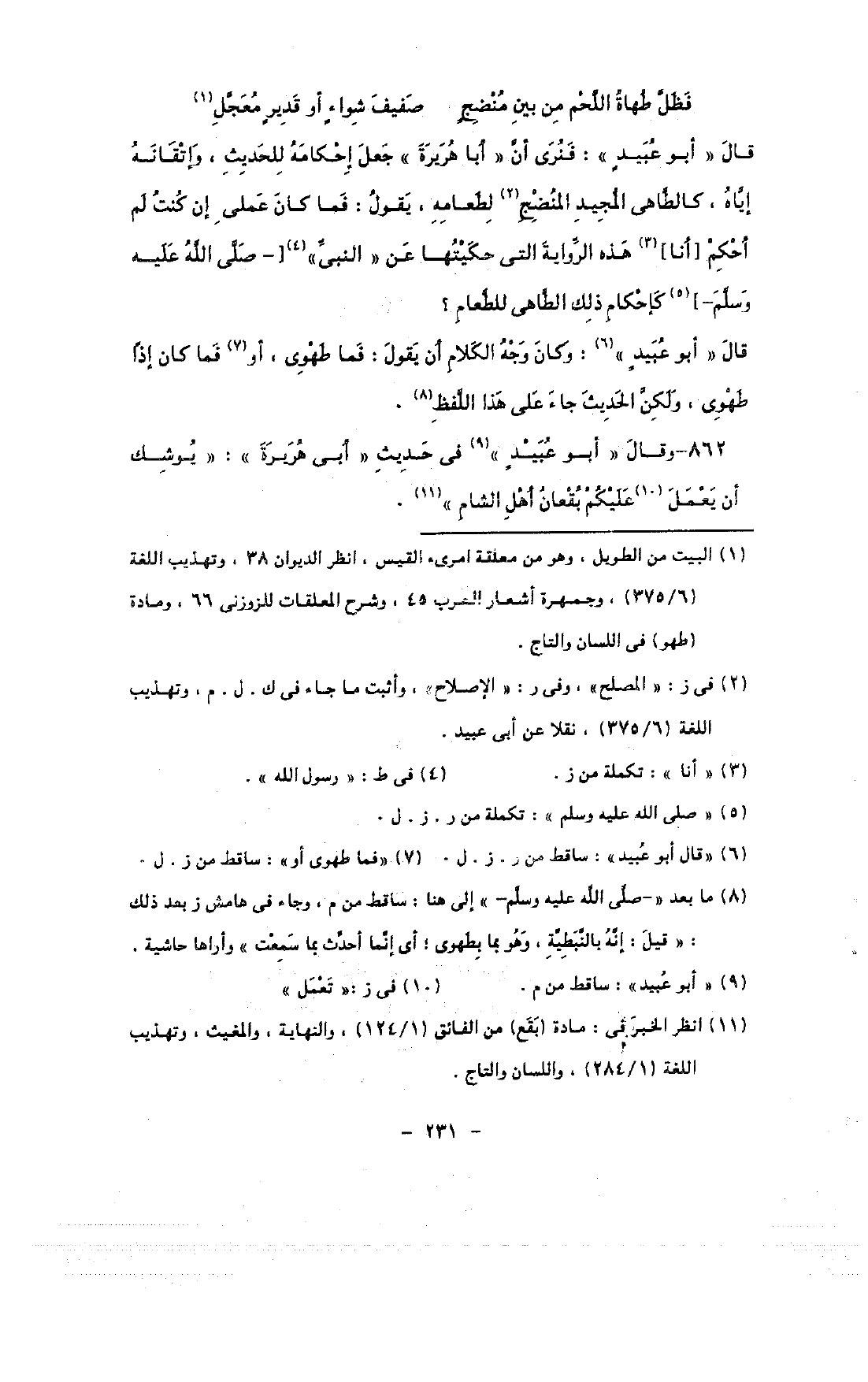 قال «أبو عبيد»: فنرى أن «أبا هريرة» جعل إحكامه للحديث, وإتقانه إياه, كالطاهى المجيد المنضج لطعامه, يقول: فما كان عملى إن كنت لم أحكم [أنا] هذه الرواية التى حكيتها عن «النبى» [- صلى الله عليه وسلم -] كإحكام ذلك الطاهى للطعام؟