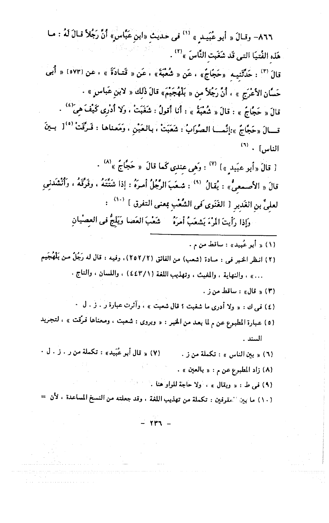 866 - وقال «أبو عبيد» في حديث «ابن عباس» أن رجلًا قال له: ما هذه الفتيا التى قد شغبت الناس».