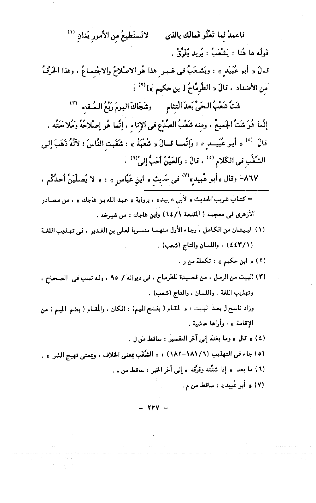 قال «أبو عبيد»: ويشعب في غير هذا هو الاصلاح والاجتماع, وهذا الحرف من الأضداد, قال «الطرماح [بن حكيم»]: