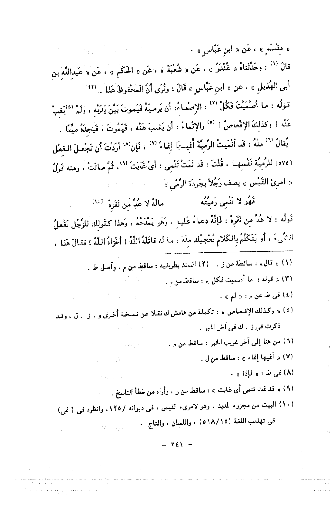 يقال منه: قد أنميت الرمية أنميها إنماء, فإن أردت أن تجعل الفعل [575] للرمية نفسها, قلت: قد نمت تنمى: أى غابت, ثم ماتت, ومنه قول «امرئ القيس» يصف رجلًا بجودة الرمى: