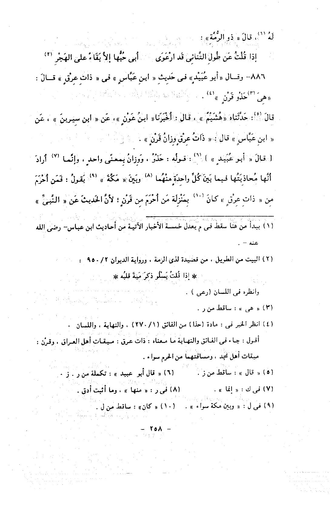 886 - وقال «أبو عبيد» في حديث «ابن عباس» في «ذات عرق» قال: «هى حذو قرن».