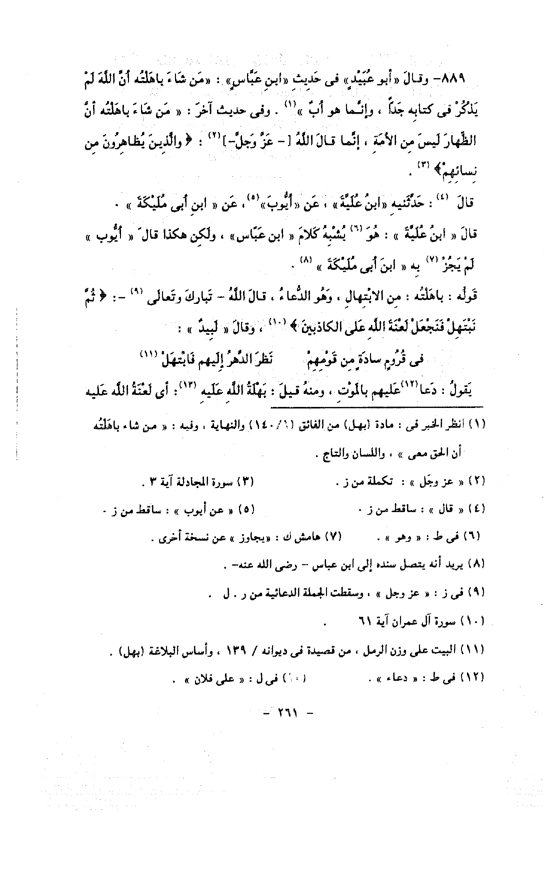 889 - وقال «أبو عبيد» في حديث «ابن عباس»: «من شاء باهلته أن الله لم يذكر في كتابه جدا, وإنما هو أب». وفي حديث آخر: «من شاء باهلته أن الظهار ليس من الأمة, إنما قال الله [- عز وجل -]: {والذين يظاهرون من نسائهم}.