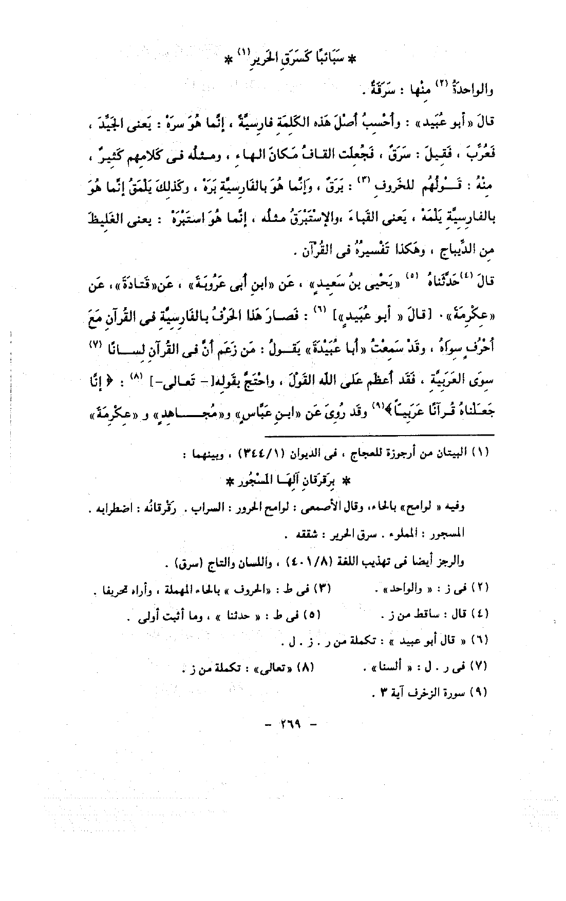 قال حدثناه «يحيى بن سعيد» , عن «ابن أبى عروبة» , عن «قتادة» , عن «عكرمة». [قال «أبو عبيد»]: فصار هذا الحرف بالفارسية فى القرآن مع أحرف سواه, وقد سمعت «أبا عبيدة» يقول: من زعم أن في القرآن لسانًا سوى العربية, فقدأعظم على الله القول, واحتج بقوله [- تعالى -]: {إنا جعلناه قرآنًا عربيًا} وقد روى عن «ابن عباس» و «مجاهد» و «عكرمة»