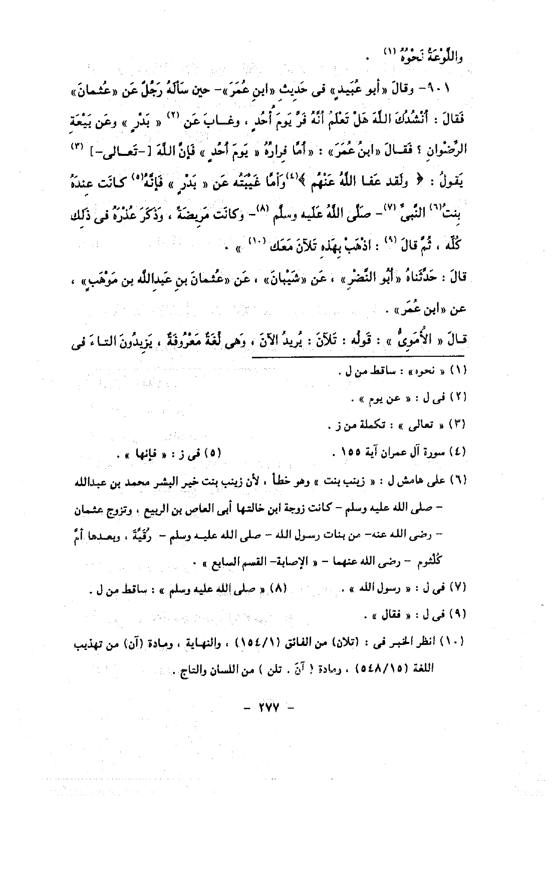 901 - وقال «أبو عبيد» فيث حديث «ابن عمر» - حين سأله رجل عن «عثمان» فقال: أنشدك الله هل تعلم أنه فر يوم أحد, وغاب عن «بدر» وعن بيعة الرضوان؟ فقال «ابن عمر»: «أما فراره «يوم أحد» فإن الله [- تعالى -] يقول: {ولقد عفا الله عنهم} وأما غيبته عن «بدر» فإنه كانت عنده بنت النبى - صلى الله عليه وسلم - وكانت مريضة, وذكر عذره في ذلك كله, ثم قال: اذهب بهذه تلآن معك».