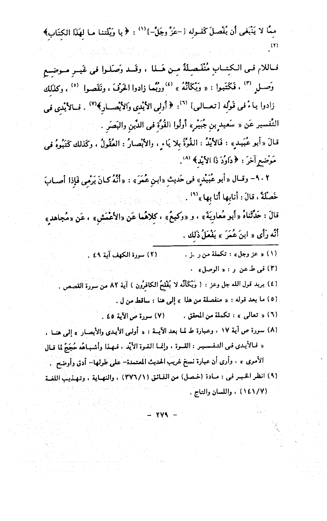 فاللام في الكتاب منفصلة من هذا, وقد وصلوا في غير موضع وصل, فكتبوا: «ويكأنه» وربما زادوا الحرف, ونقصوا, وكذلك زادوا ياء في قوله [تعالى]: {أولى الأيدى والأبصار}. فاليدى فى التفسير عن «سعيد بن جبير» أولوا القوة في الدين والبصر.