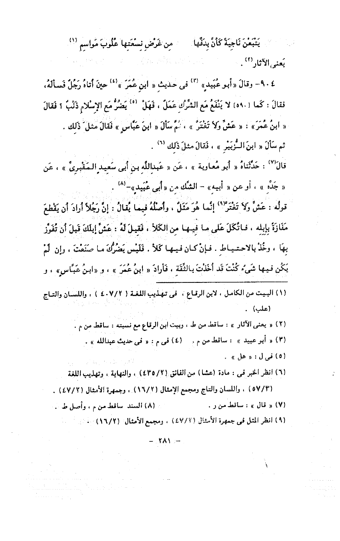 904 - وقال «أبو عبيد» في حديث «ابن عمر» حين أتاه رجل فسأله, فقال: كما [590] لا ينفع مع الشرك عمل, فهل يضر مع الإسلام ذنب؟ فقال «ابن عمر»: «عش ولا تغتر» , ثم سأل «ابن عباس» فقال مثل ذلك.