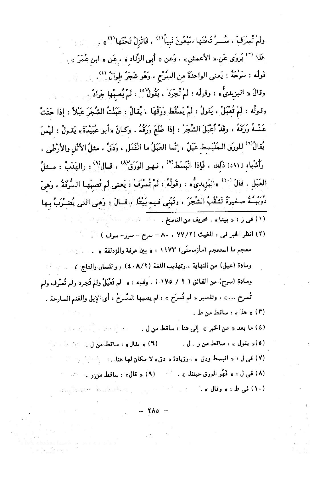وقوله: لم تعبل, يقول: لم يسقط ورقها, يقال: عبلت الشجر عبلًا: إذا حتت عنه ورقه, وقد اعبل الشجر: إذا طلع ورقه. وكان «أبو عبيدة» يقول: ليس يقال للورق المنبسط عبل, إنما العبل ما انتفل, ودق , مثل الأثل والأرطى, وأشباه [592] ذلك, فإذا انبسط, فهو الورق, قال: والهدب: مثل العبل. قال «اليزيدى»: وقوله: لم تسرف: يعنى لم تصبها السرقة, وهى دويبة صغيرة تثقب الشجر, وتبنى فيه بيتًا, قال: وهى التى يضرب بها