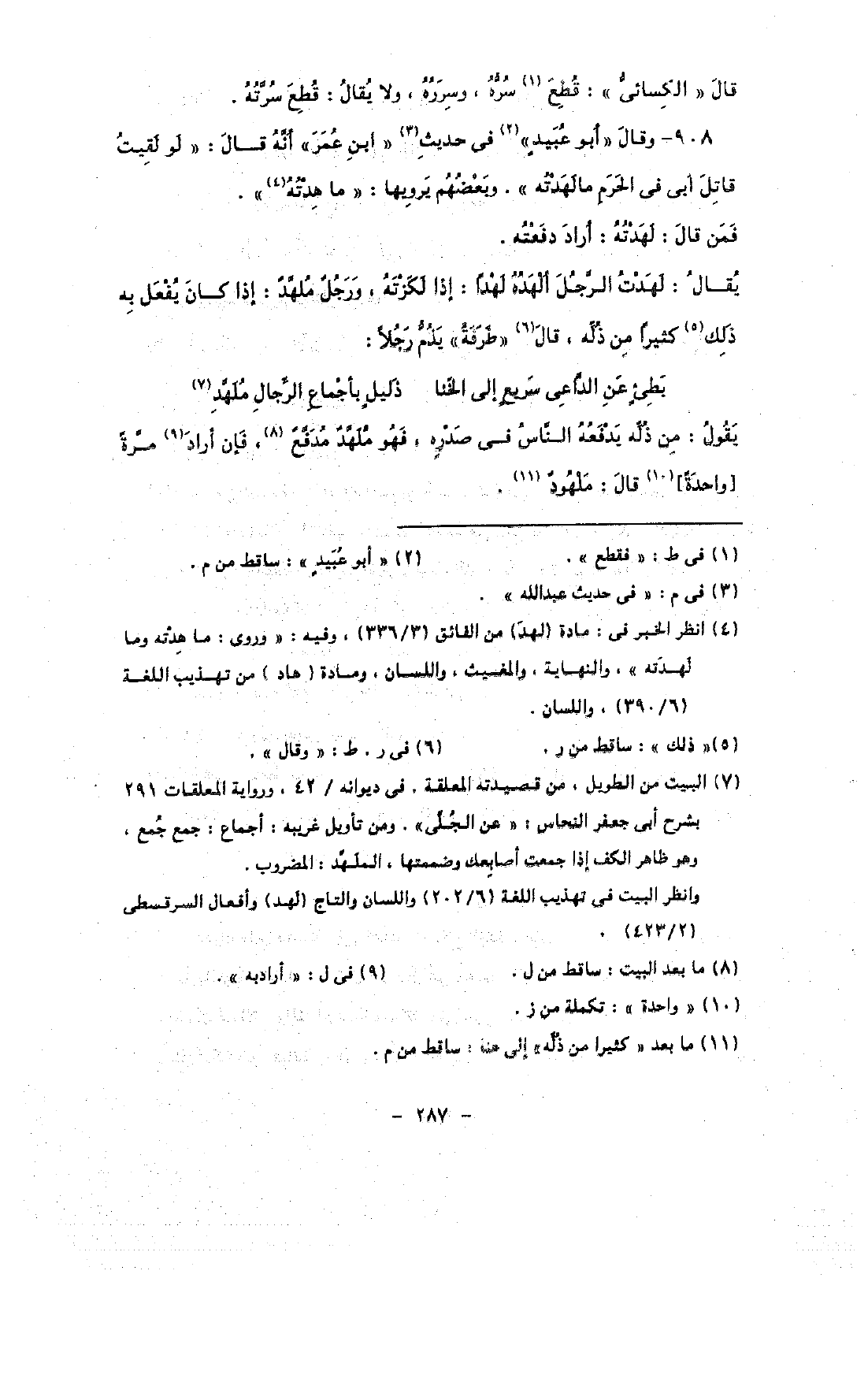 908 - وقال «أبو عبيد» في حديث «ابن عمر» أنه قال: «لو لقيت قاتل أبى فى الحرم ما لهدته». وبعضهم يرويها: «ما هدته».