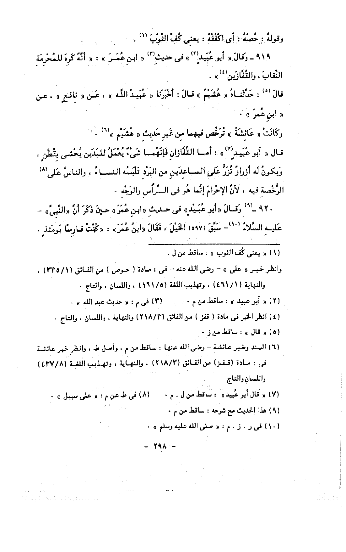 919 - وقال «أبو عبيد» فى حديث «ابن عمر»: «أنه كره للمحرمة النقاب, والقفازين».