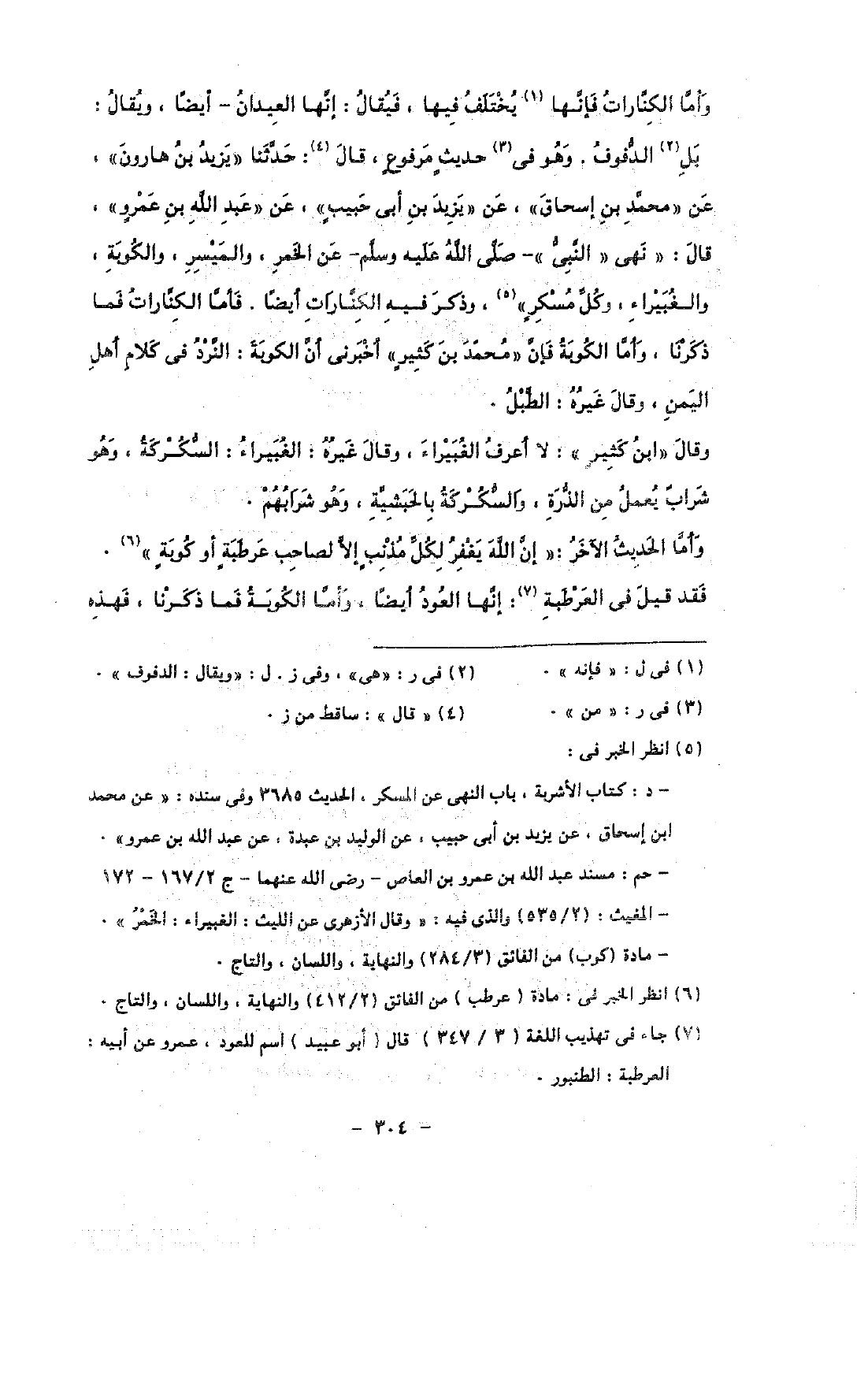 وأما الكنارات فإنها يختلف فيها, فيقال: إنها العيدان - أيضًا, ويقال: بل الدفوف. وهو فى حديث مرفوع, قال: حدثنا «يزيد بن هارون» , عن «محمد بن إسحاق» , عن «يزيد بن أبى حبيب» , عن «عبد الله بن عمرو» , قال: «نهى «النبى» - صلى الله عليه وسلم - عن الخمر, والميسر, والكوبة, والغبيراء, وكل مسكر» , وذكر فيه الكنارات أيضًا. فأما الكنارات فما ذكرنا, وأما الكوبة فإن «محمد بن كثير» أخبرنى أن الكوبة: النرد فى كلام أهل اليمن, وقال غيره: الطبل.