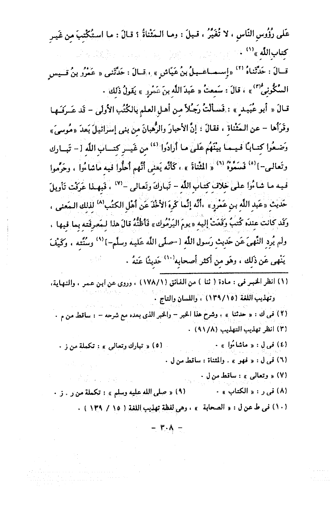 قال «أبو عبيد»: فسألت رجلًا من أهل العلم بالكتب الأولى - قد عرفها وقرأها - عن المثناة, لإقال: إن الأحبار والرهبان من بنى إسرائيل بعد «موسى» وضعوا كتابًا فيما بينهم على ما أرادوا من غير كتاب الله [- تبارك وتعالى -] فسموه «المثناة» , كأنه يعنى أنهم أحلوا فيه ما شاءوا, وحرموا فيه ما شاءوا على خلاف كتاب الله - تبارك وتعالى -, فبهذا عرفت تأويل حديث «عبد الله بن عمرو» , أنه إنما كره الأخذ عن أهل الكتب لذلك المعنى, وقد كانت عنده كتب وقعت إليه «يوم اليرموك» فأظنه قال هذا لمعرفته بما فيها, ولم يرد النهى عن حديث رسول الله [- صلى الله عليه وسلم -] وسنته, وكيف ينهى عن ذلك, وهو من أكثر أصحابه حديثًا عنه.