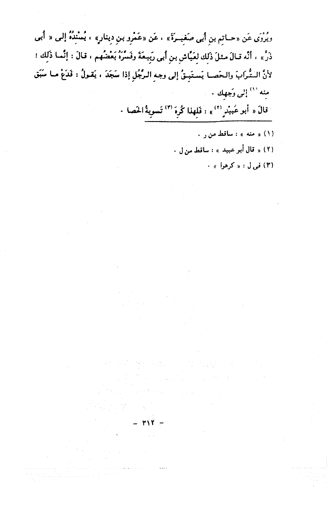 ويروى عن «حاتم بن أبى صغايرة» , عن «عمرو بن دينار» , يسنده إلى «أبى ذر» , أنه قال مثل ذلك لعياش بن أبى ربيعة وفسره بعضهم, قال: إنما ذلك, لأن التراب والحصا يستبق إلى وجه الرجل إذا سجد, يقول: فدع ما سبق منه إلى وجهك.