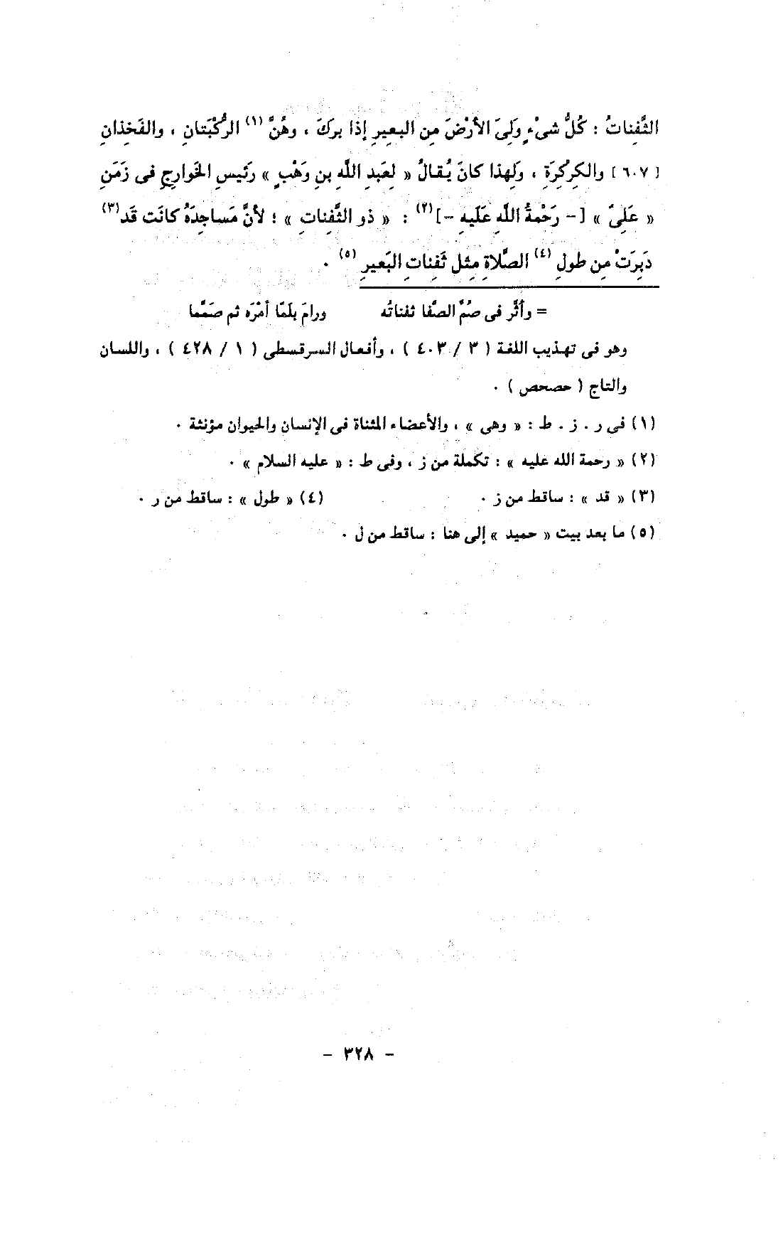 الثفنات: كل شئ ولى الأرض من البعير إذا برك, وهن الركبتان, والفخذان [607] والكركة, ولهذا كان يقال «لعبد الله بن وهب» رئيس الخوارج فى زمن «على» [- رحمة الله عليه -]: «والثفنات» , لأن مساجده كانت قد دبرت من طول الصلاة مثل ثفنات البعير.