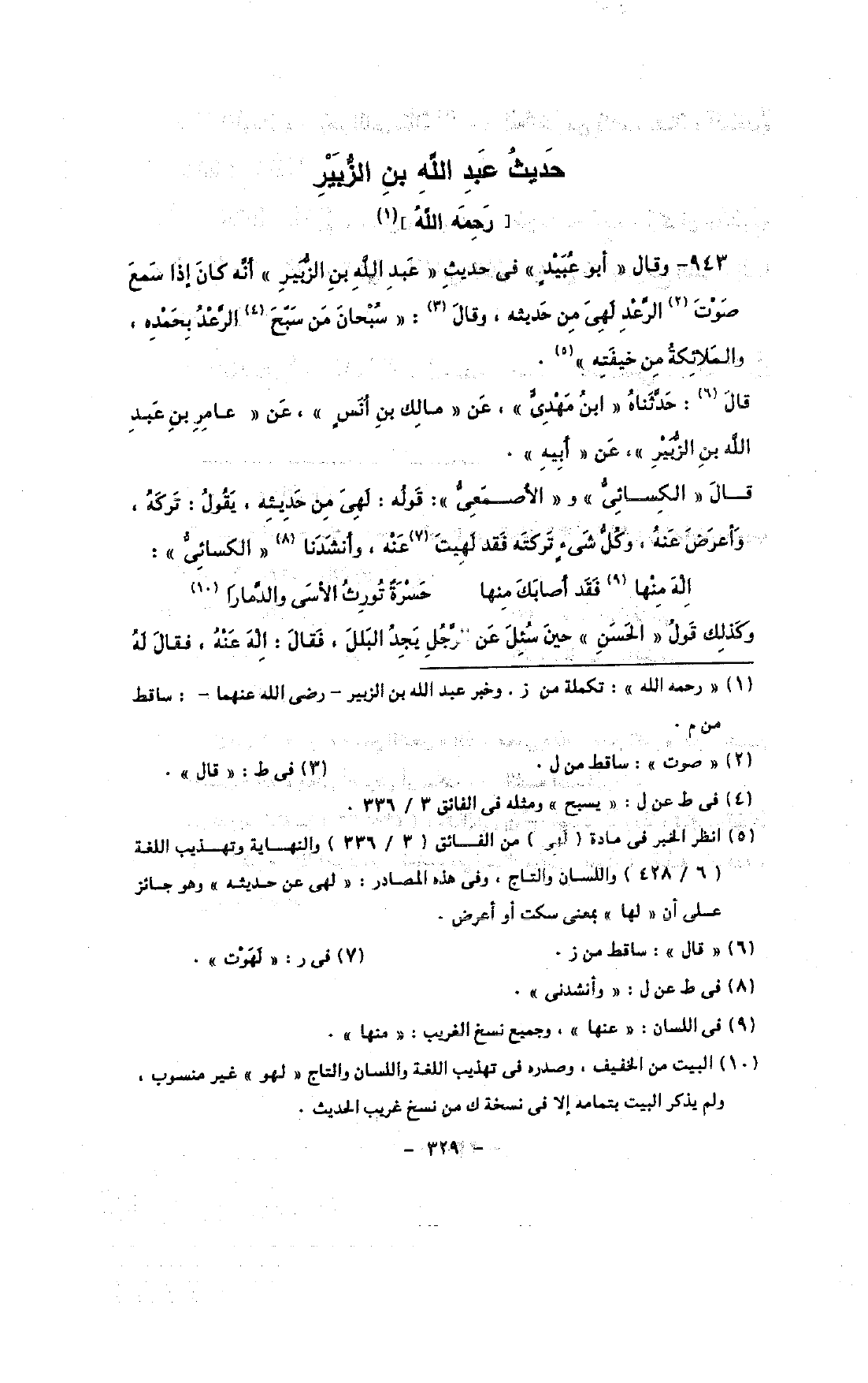 943 - وقال «أبو عبيد» فى حديث «عبد الله بن الزبير» أنه كان إذا سمع صوت الرعد لهى من حديثه, وقال: «سبحان من سبح الرعد بحمده, والملائكة من خيفته».