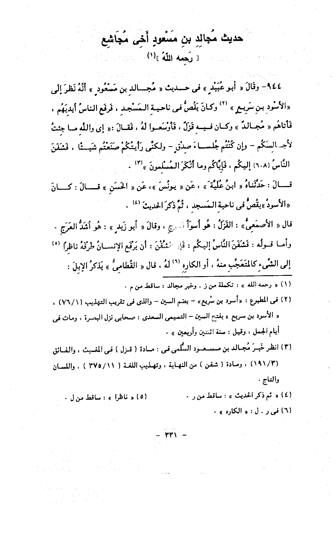 944 - وقال «أبو عبيد» فى حديث «مجالد بن مسعود» أنه نظر إلى «الأسود بن سريع» وكان يقص فى ناحية المسجد, فرفع الناس أيديهم, فأتاهم «مجالد» وكان فيه قزل, فأوسعوا له, فقال: «إى والله ما جئت لأجالسكم - وإن كنتم جلساء صدق - ولكنى رأيتكم صنعتم شيئًا, فشفن الناس [608] إليكم, فإياكم وما أنكر المسلمون».