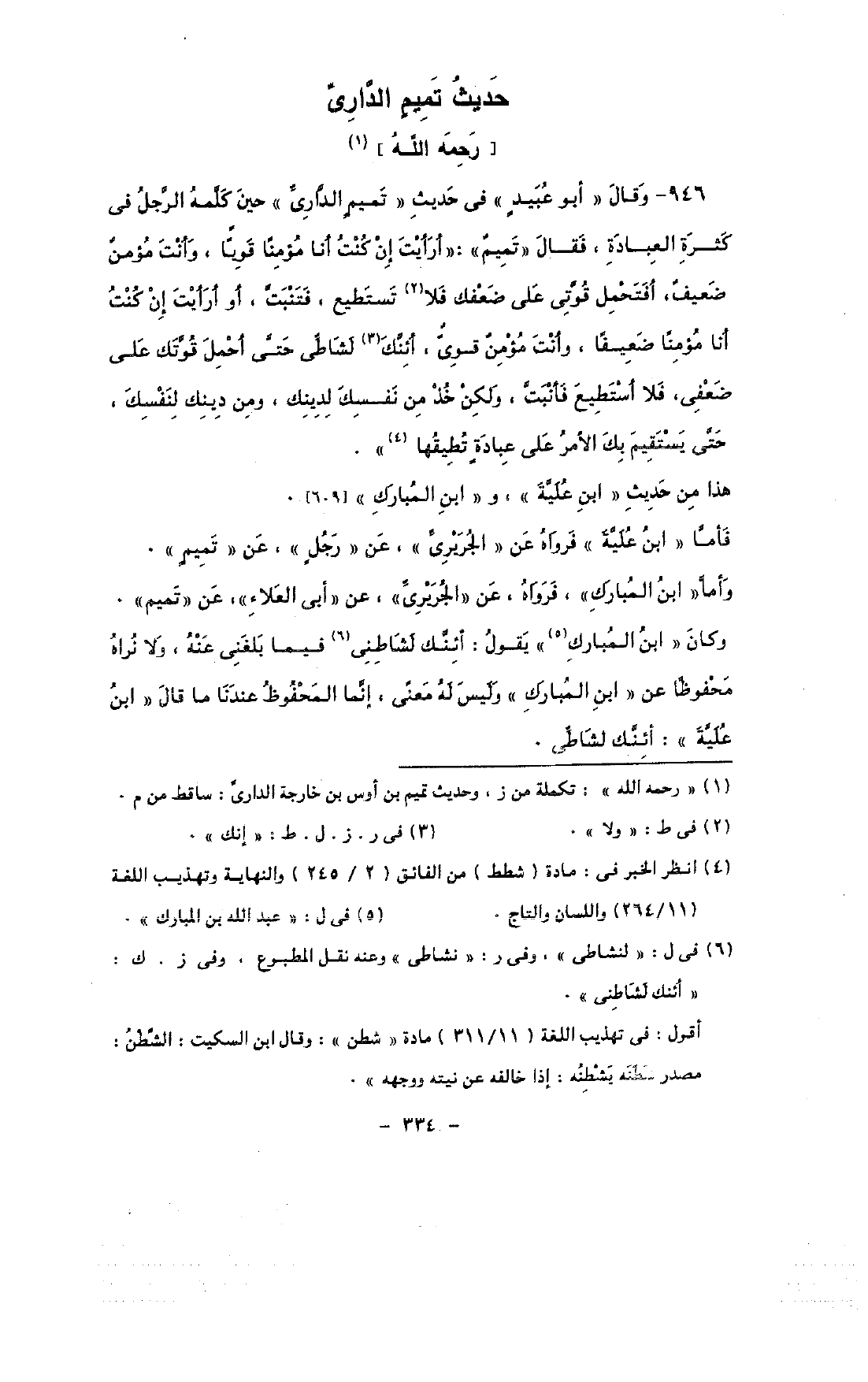 946 - وقال «أبو عبيد» فى حديث «تميم الدارى» حين كلمه الرجل في كثرة العبادة, فقال «تميم»: «أرأيت إن كنت أنا مؤمنًا قويًا, وأنت مؤمن ضعيف, أفتحمل قوتى على ضعفك فلا تستطيع, فتنبت, أو أرأيت إن كنت أنا مؤمنًا ضعيفًا, وأنت مؤمن قوى, أئنك لشاطى حتى أحمل قوتك على ضعفى, فلا أستطيع فأنبت, ولكن خذ من نفسك لدينك, ومن دينك لنفسك, حتى يستقيم بك الأمر على عبادة تطيقها».
