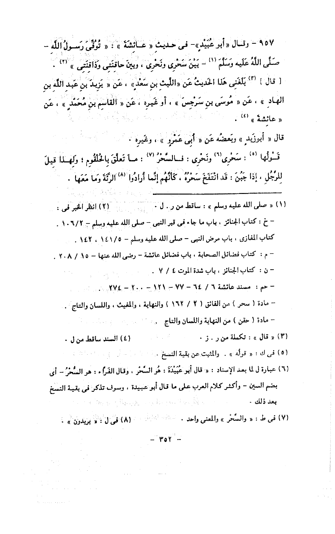 957 - وقال «أبو عبيد» - فى حديث «عائشة»: «توفى رسول الله - صلى الله عليه وسلم - بين سحرى ونحرى, وبين حاقنتى وذاقنتى».