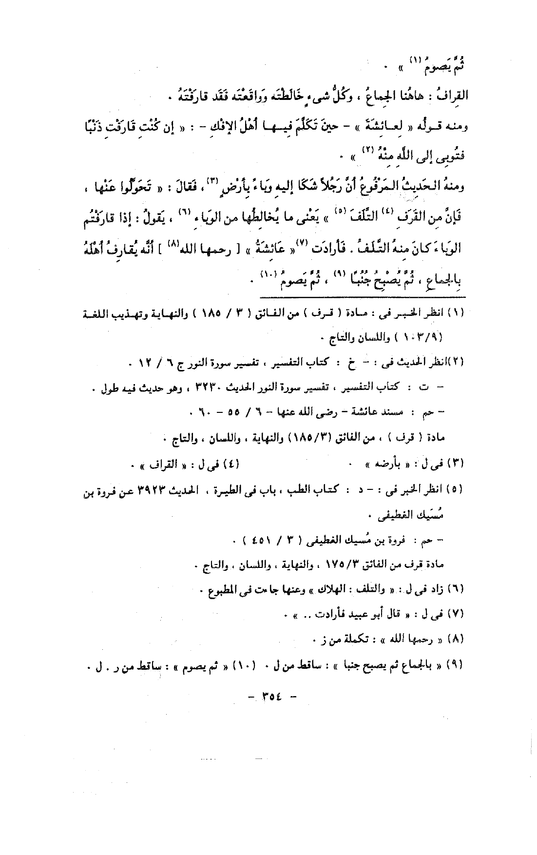 ومنه الحديث المرفوع أن رجلًا شكا إليه وباء بأرض, فقال: «تحولوا عنها, فإن من القرف التلف» يعنى ما يخالطها من الوباء, يقول: إذا قارفتم الوباء كان منه التلف. فأردات «عائشة» [رحمها الله] أنه يقارف أهله بالجماع, ثم يصبح جنبًا, ثم يصوم.