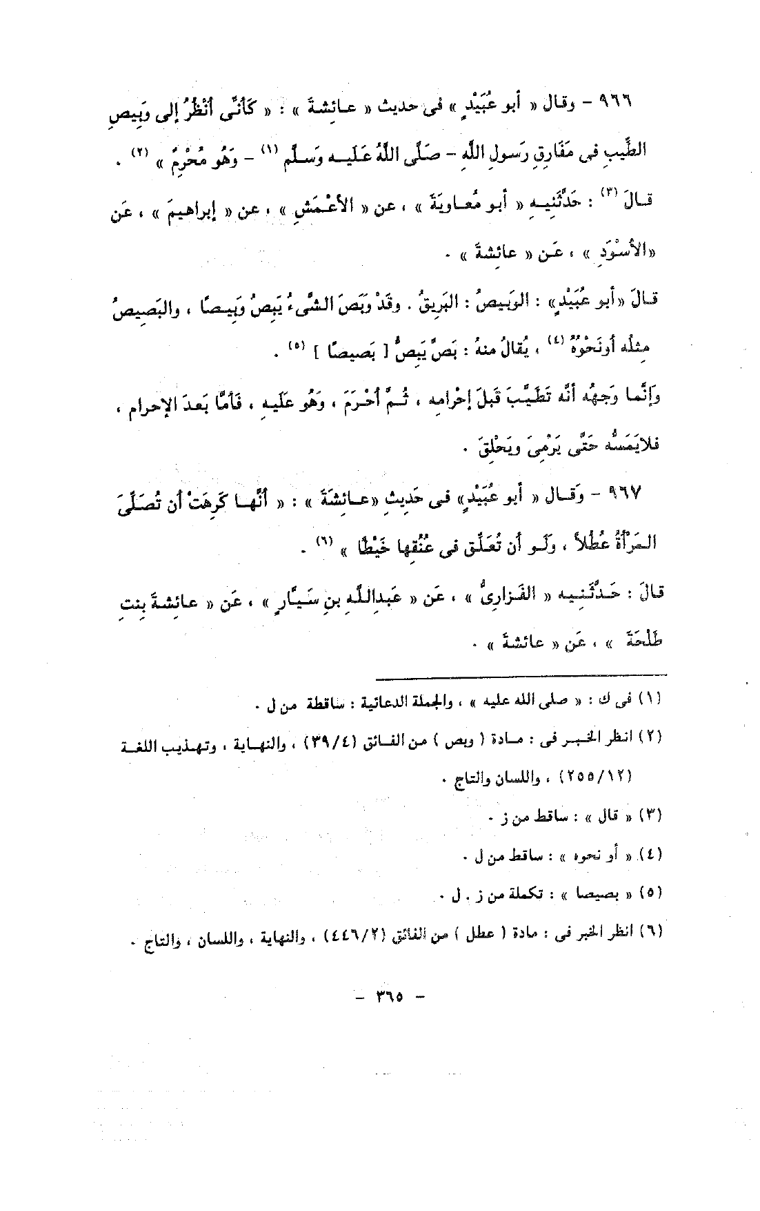 966 - وقال «أبو عبيد» فى حديث «عائشة»: «كأنى أنظر إلى وبيص الطيب فى مفارق رسول الله - صلى الله عليه وسلم - وهو محرم».