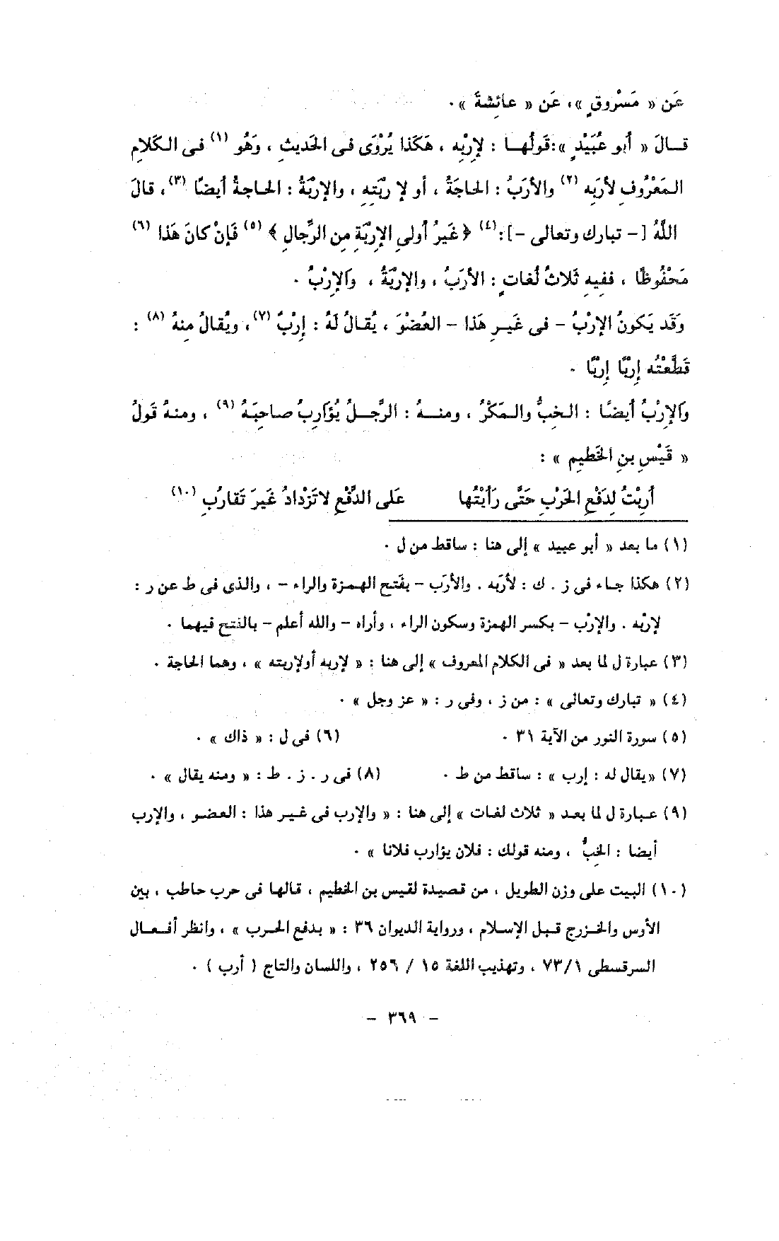 قال «أبو عبيد»: قولها: لإربه, هكذا يروى فى الحديث, وهو فى الكلام المعروف لأربه والأرب: الحاجة, أو لإربته, والإربة: الحاجة أيضًا, قال الله [- تبارك وتعالى -]: {غير أولى الإربة من الرجال} فإن كان هذا محفوظًا, ففيه ثلاث لغات: الأرب, والإربة, والإرب.