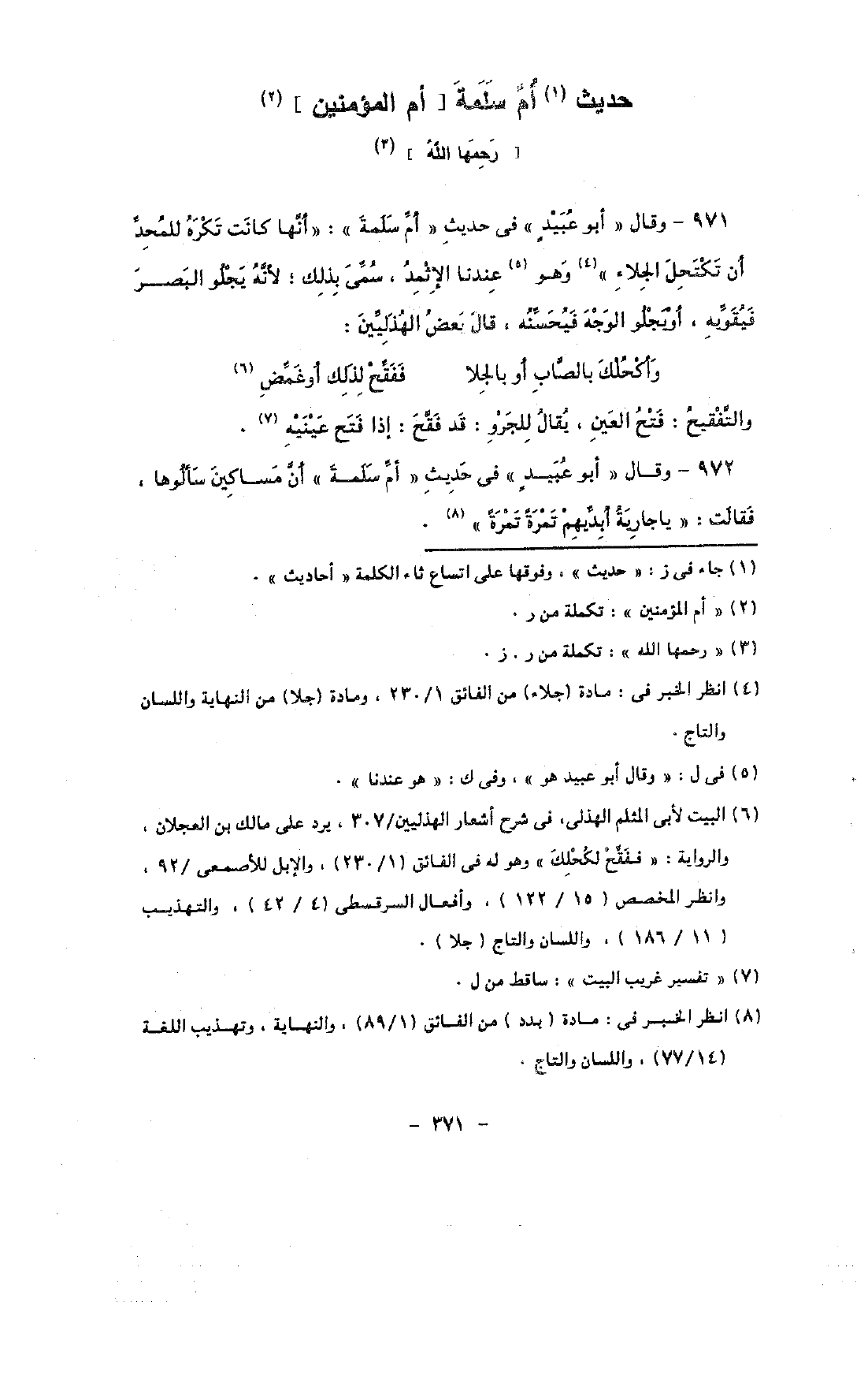 971 - وقال «أبو عبيد» فى حديث «أم سلمة»: «أنها كانت تكره للمحد أن تكتحل الجلاء» وهو عندنا الإثمد, سمى بذلك, لأنه يجلو البصر فيقويه, أو يجلو الوجه فيحسنه, قال بعض الهذليين:
