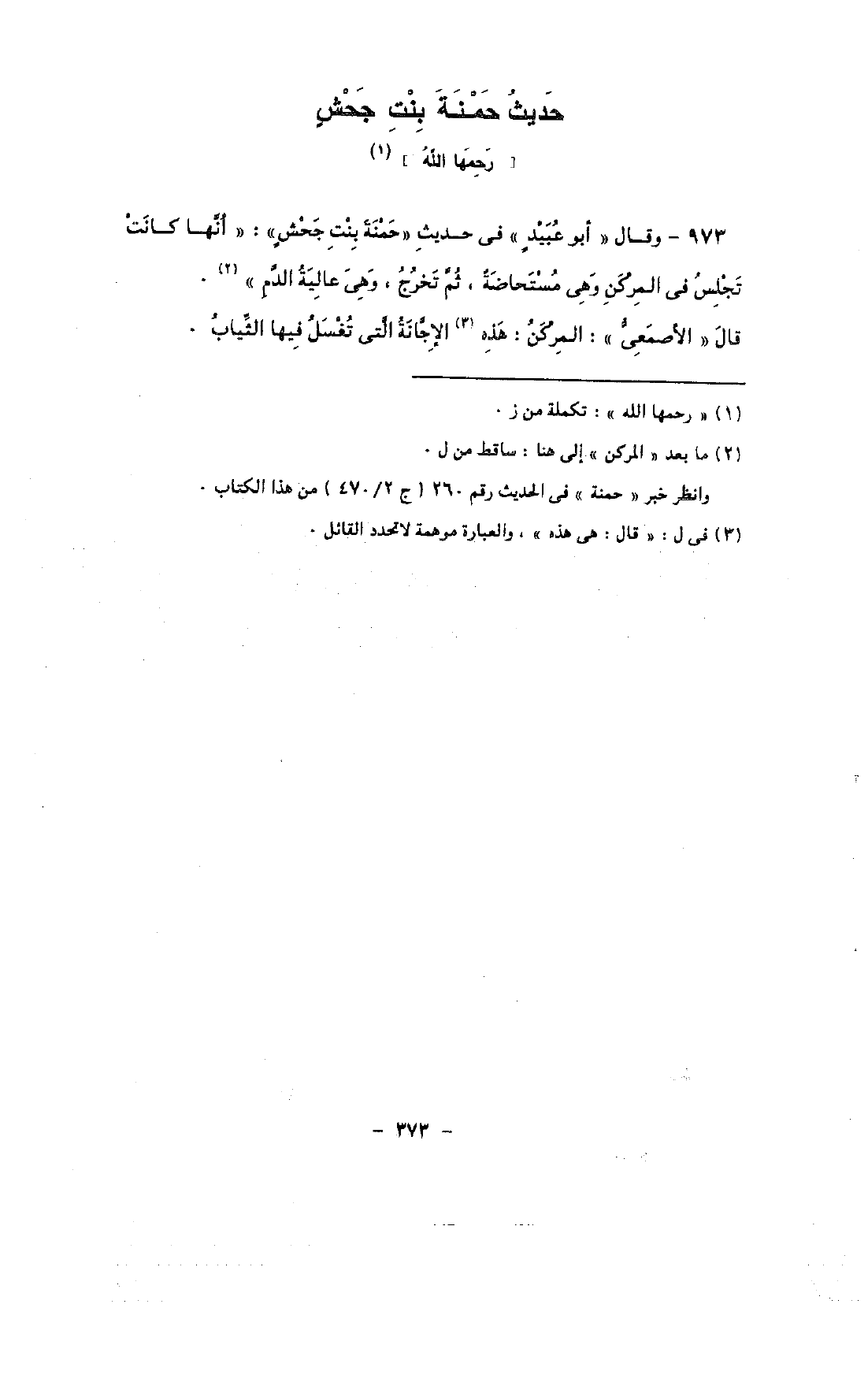 973 - وقال «أبو عبيد» فى حديث «حمنة بنت جحش»: «أنها كانت تجلس في المركن وهى مستحاضة, ثم تخرج, وهى عالية الدم».