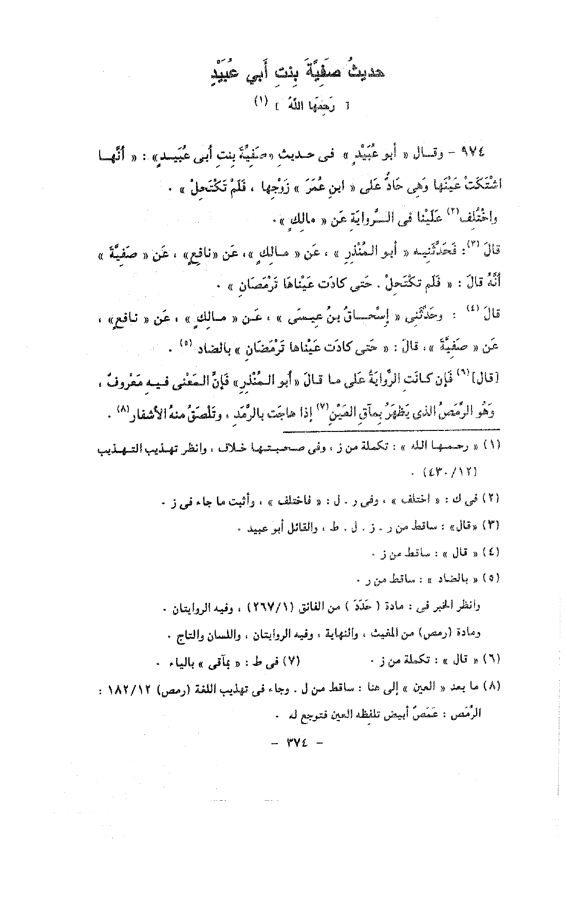 974 - وقال «أبو عبيد» فى حديث «صفية بنت أبى عبيد»: «أنها اشتكت عينها وهى حاد على «ابن عمر» زوجها, فلم تكتحل».