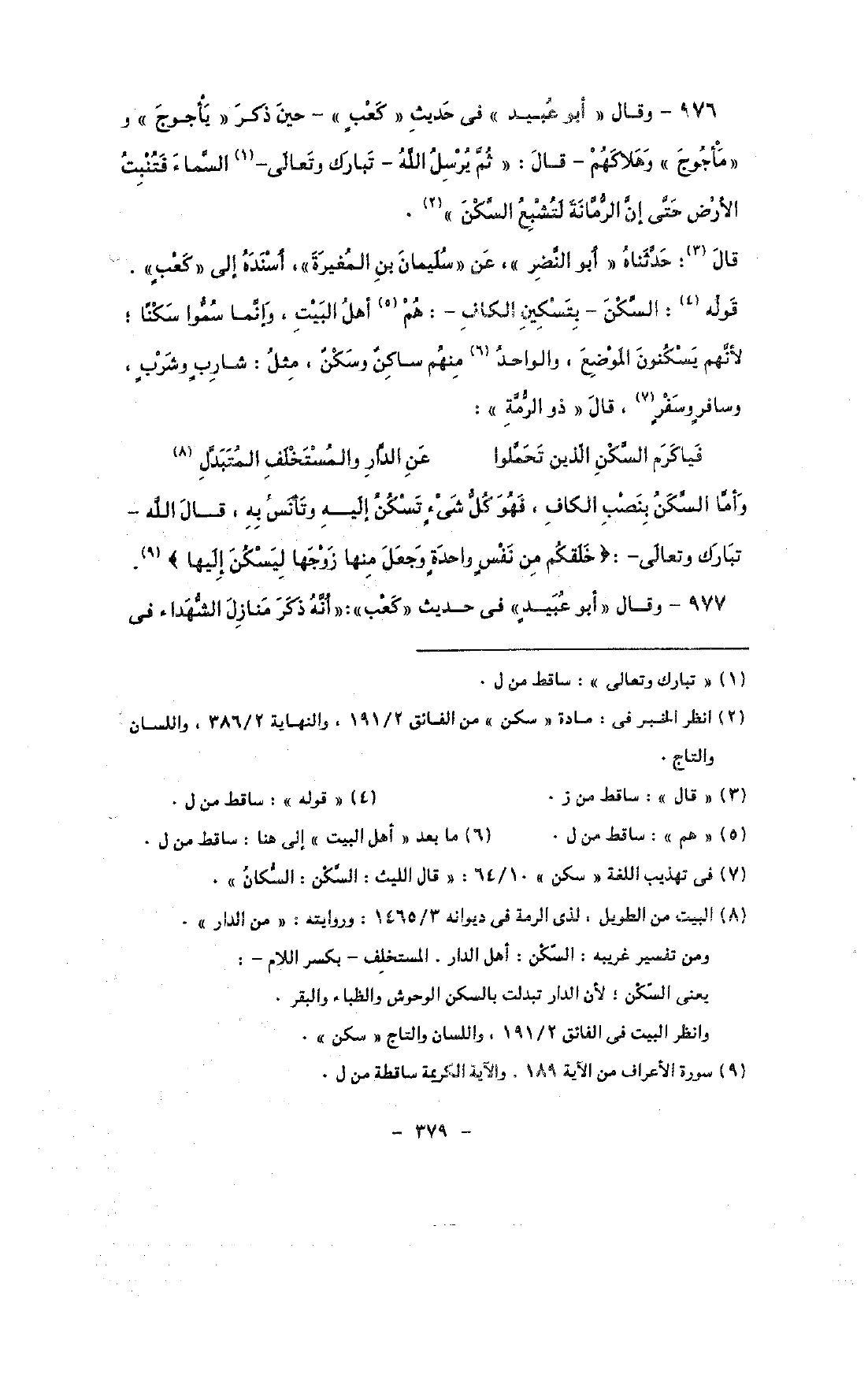 976 - وقال «أبو عبيد» فى حديث «كعب» - حين ذكر «يأجوج» و «مأجوج» وهلاكهم - قال: «ثم يرسل الله - تبارك وتعالى - السماء فتنبت الأرض حتى إن الرمانة لتشبع السكن».