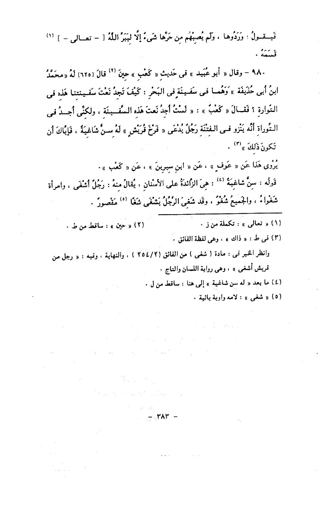 980 - وقال «أبو عبيد» فى حديث «كعب» حين قال [625] له «محمد ابن أبى حذيفة» وهما فى سفينة فى البحر: كيف تجد نعت سفينتنا هذه فى التوراة؟ فقال «كعب»: «لست أجد نعت هذه السفينة, ولكنى أجد فى التوراة أنه ينزو فى الفتنة رجل يدعى «فرخ قريش» له سن شاغية, فإياك أن تكون ذلك».