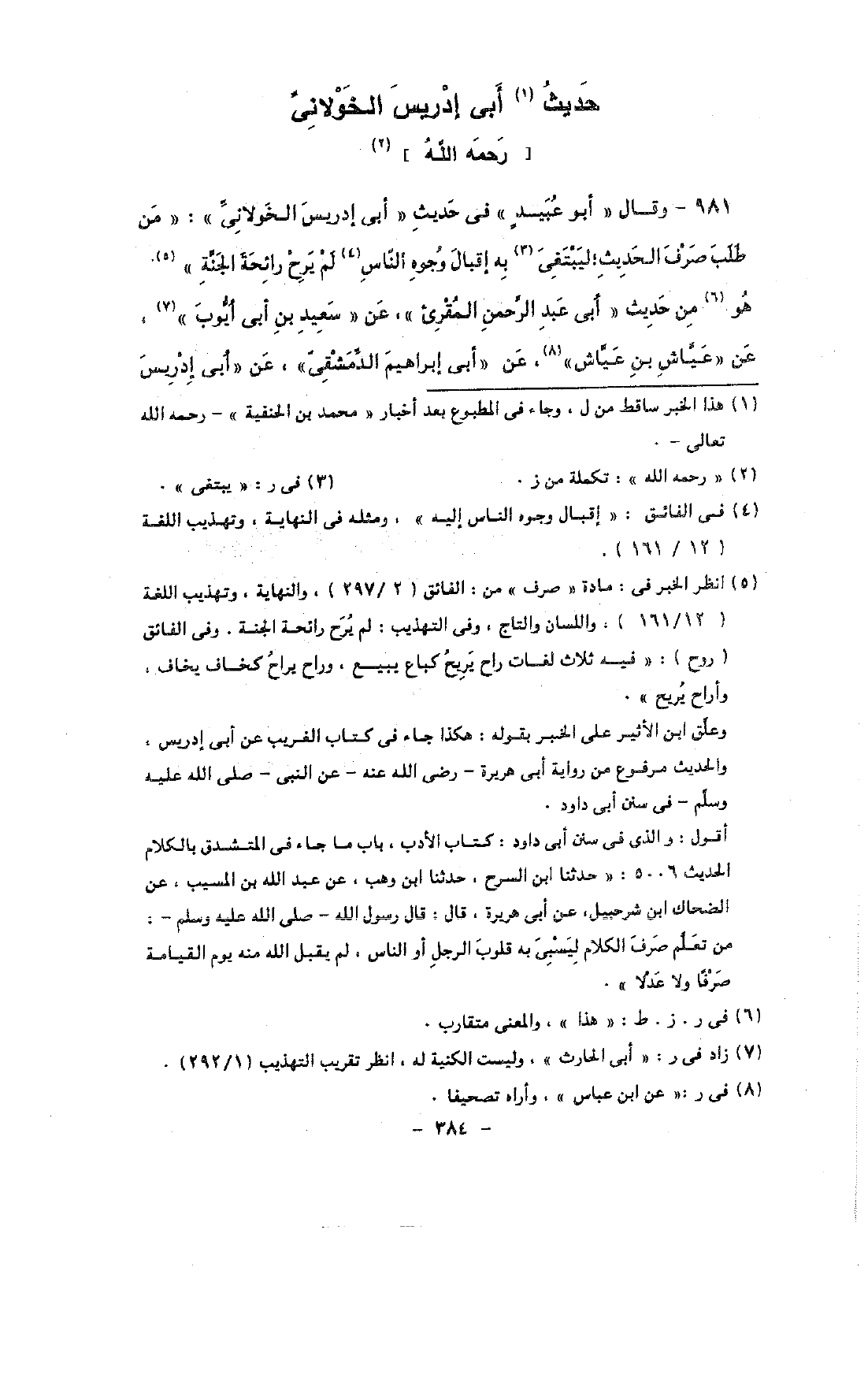 981 - وقال «أبو عبيد» فى حديث «أبى إدريس الخولانى»: «من طلب صرف الحديث, ليبتغى به إقبال وجوه الناس لم يرح رائحة الجنة».