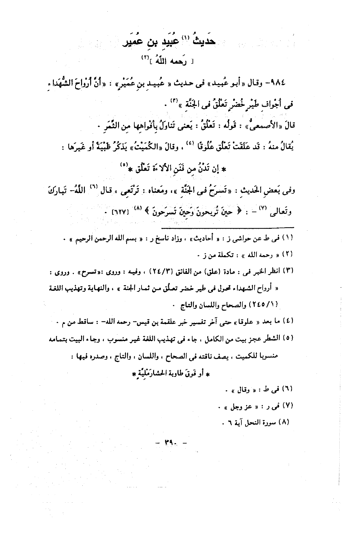 984 - وقال «أبو عبيد» فى حديث «عبيد بن عمير»: «أن أرواح الشهداء فى أجواف طير خضر تعلق فى الجنة».
