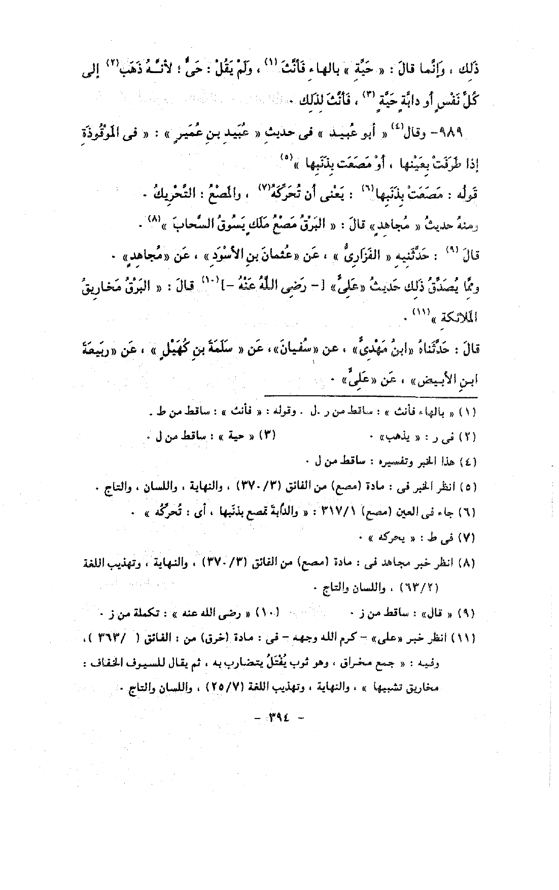 989 - وقال «أبو عبيد» فى حديث «عبيد بن عمير»: «فى الموقوذة إذا طرفت بعينها, أو مصعت بذنبها»