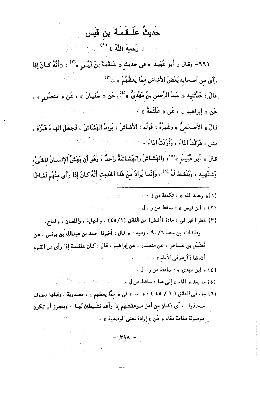 991 - وقال «أبو عبيد» فى حديث «علقمة بن قيس»: «أنه كان إذا رأى من أصحابه بعض الأشاش مما يعظهم».