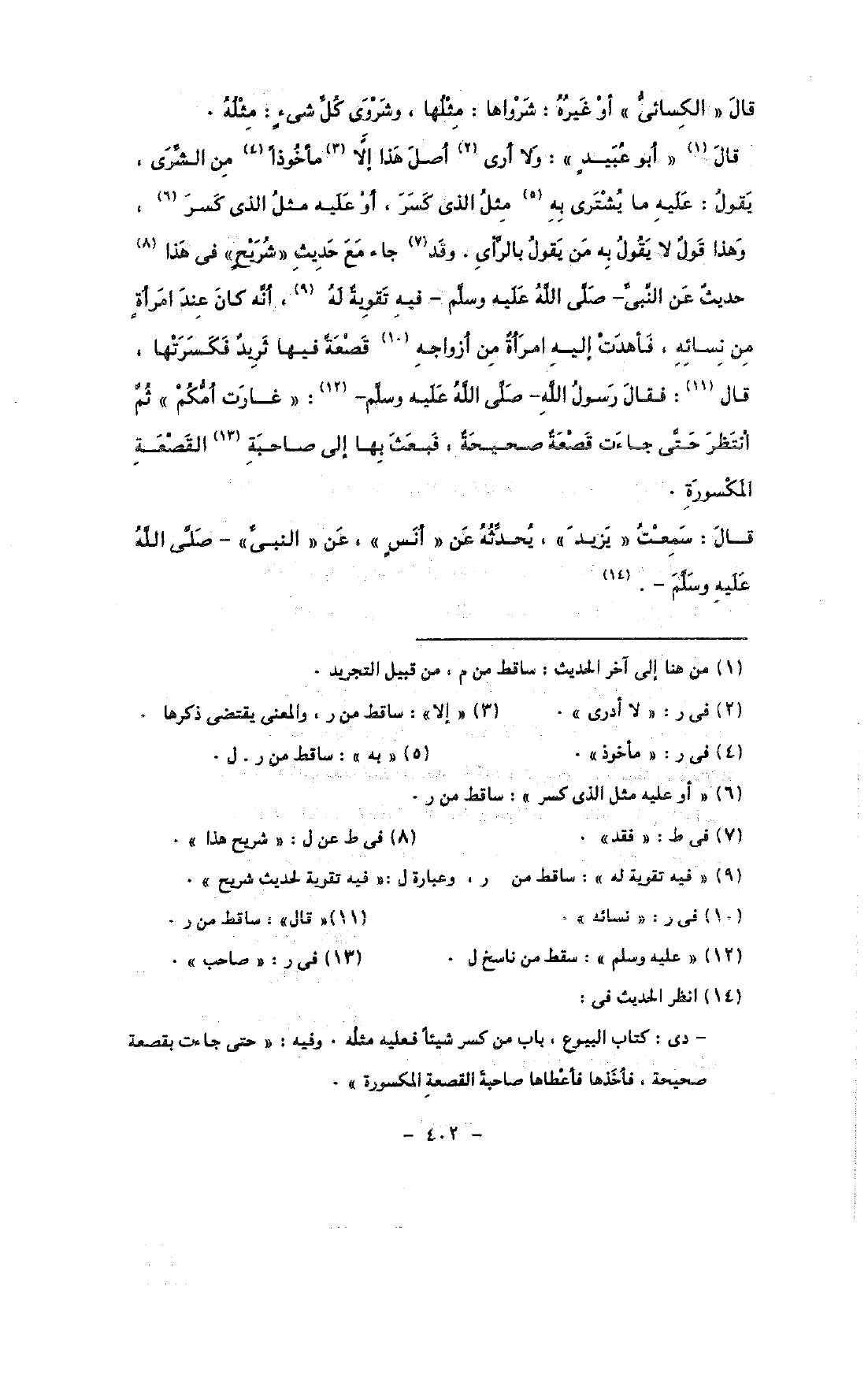 قال «أبو عبيد»: ولا أرى أصل هذا إلا مأخوذًا من الشرى, يقول: عليه ما يشترى به مثل الذى كسر, أو عليه مثل الذى كسر, وهذا قول لا يقول به من يقول بالرأى. وقد جاء مع حديث «شريح» فى هذا حديث عن النبى - صلى الله عليه وسلم - فيه تقوية له, أنه كان عند امرأة من نسائه, فأهدت إليه امرأة من أزواجه قصعة فيها ثربد فكسرتها, قال: فقال رسول الله - صلى الله عليه وسلم -: «غارت أمكم» ثم انتظر حتى جاءت قصعة صحيحة, فبعص بها إلى صاحبة القصعة المكسورة.