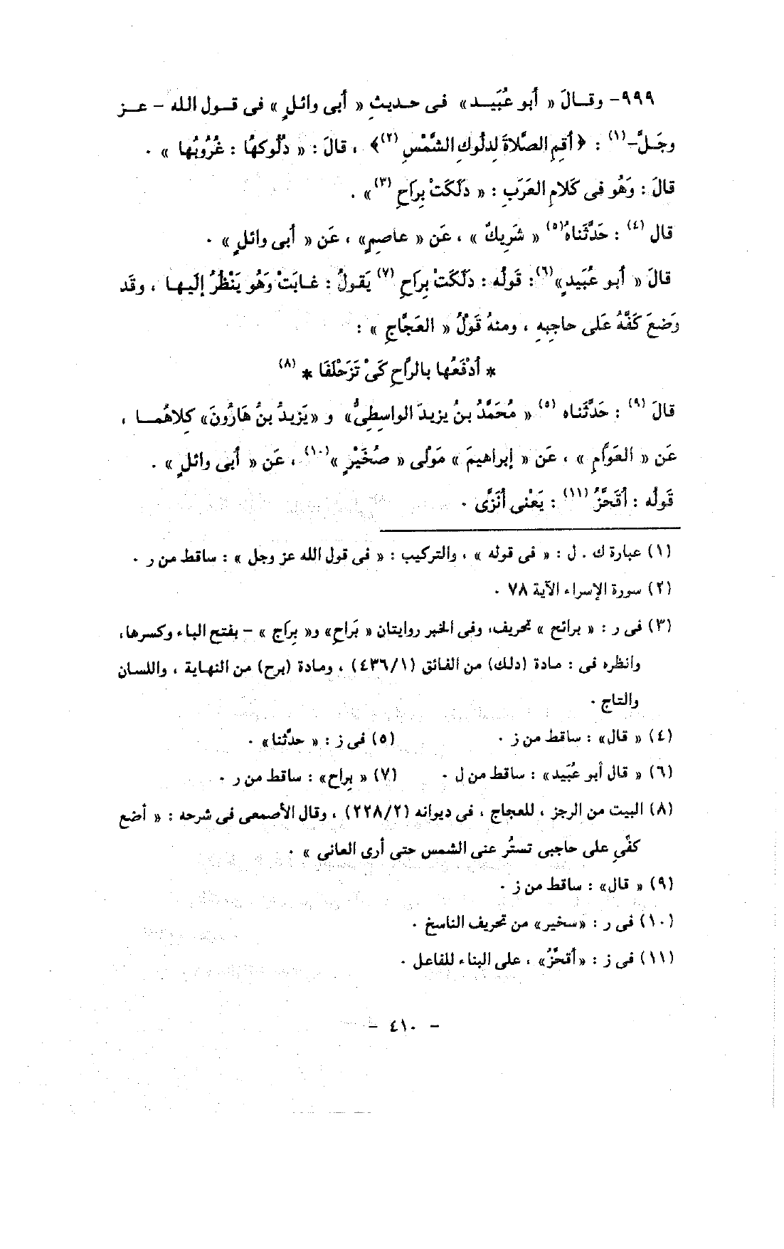 999 - وقال «أبو عبيد» فى حديث «أبى وائل» فى قول الله - عز وجل -: {أقم الصلاة لدلوك الشمس} , قال: «دلوكها: غروبها».