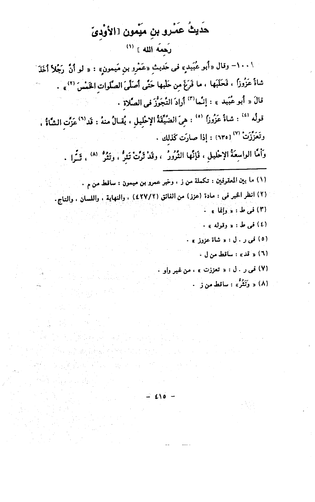 1001 - وقال «أبو عبيد» فى حديث «عمرو بن ميمون»: «لو أن رجلًا أخذ شاة عزوزًا, فحلبها, ما فرغ من حلبها حتى أصلى الصلوات الخمس».