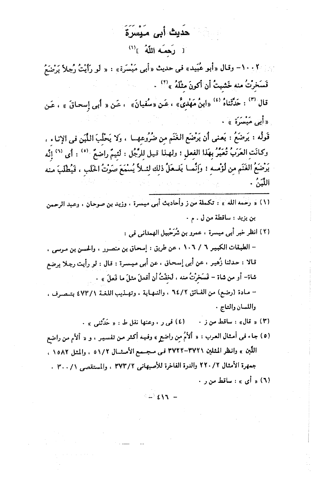 1002 - وقال «أبو عبيد» فى حديث «أبى ميسرة»: «لو رأيت رجلًا يرضع فسخرت منه خشيت أن أكون مثله».