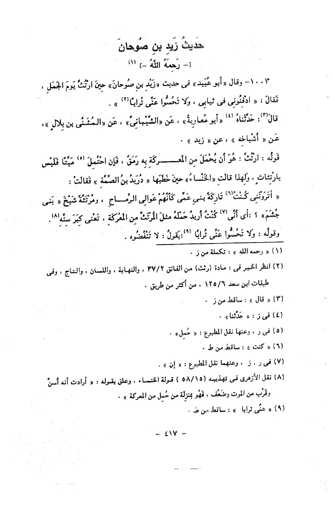 1003 - وقال «أبو عبيد» فى حديث «زيد بن صوحان» حين ارتث يوم الجمل, فقال: «ادفنونى فى ثيابى, ولا تحسوا عنى ترابًا».