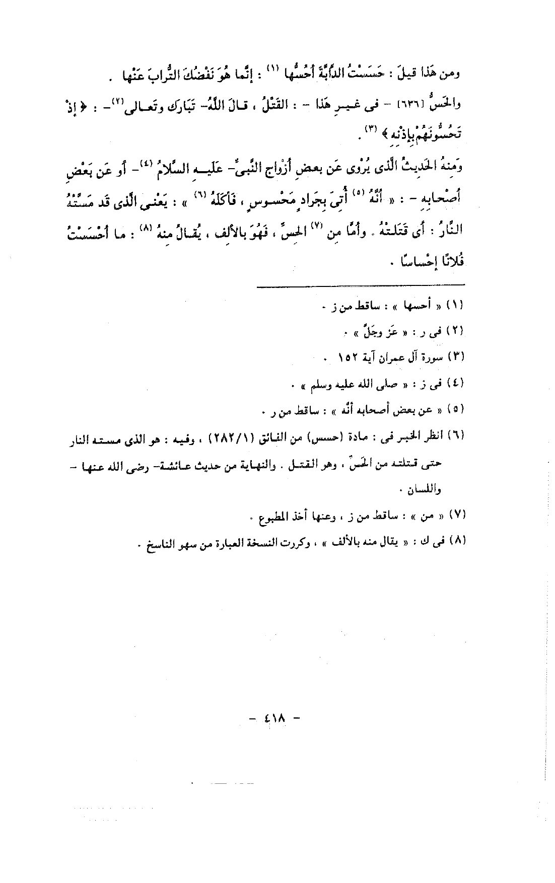 ومنه الحديث الذى يروى عن بعض أزواج النبى - صلى الله عليه وسلم - أو عن بعض أصحابه -: «أنه أتى بجراد محسوس, فأكله»: يعنى الذى قد مسته النار: أى قتلته. وأما من الحس, فهو بالألف, يقال منه: ما أحسست فلانًا إحساسًا.