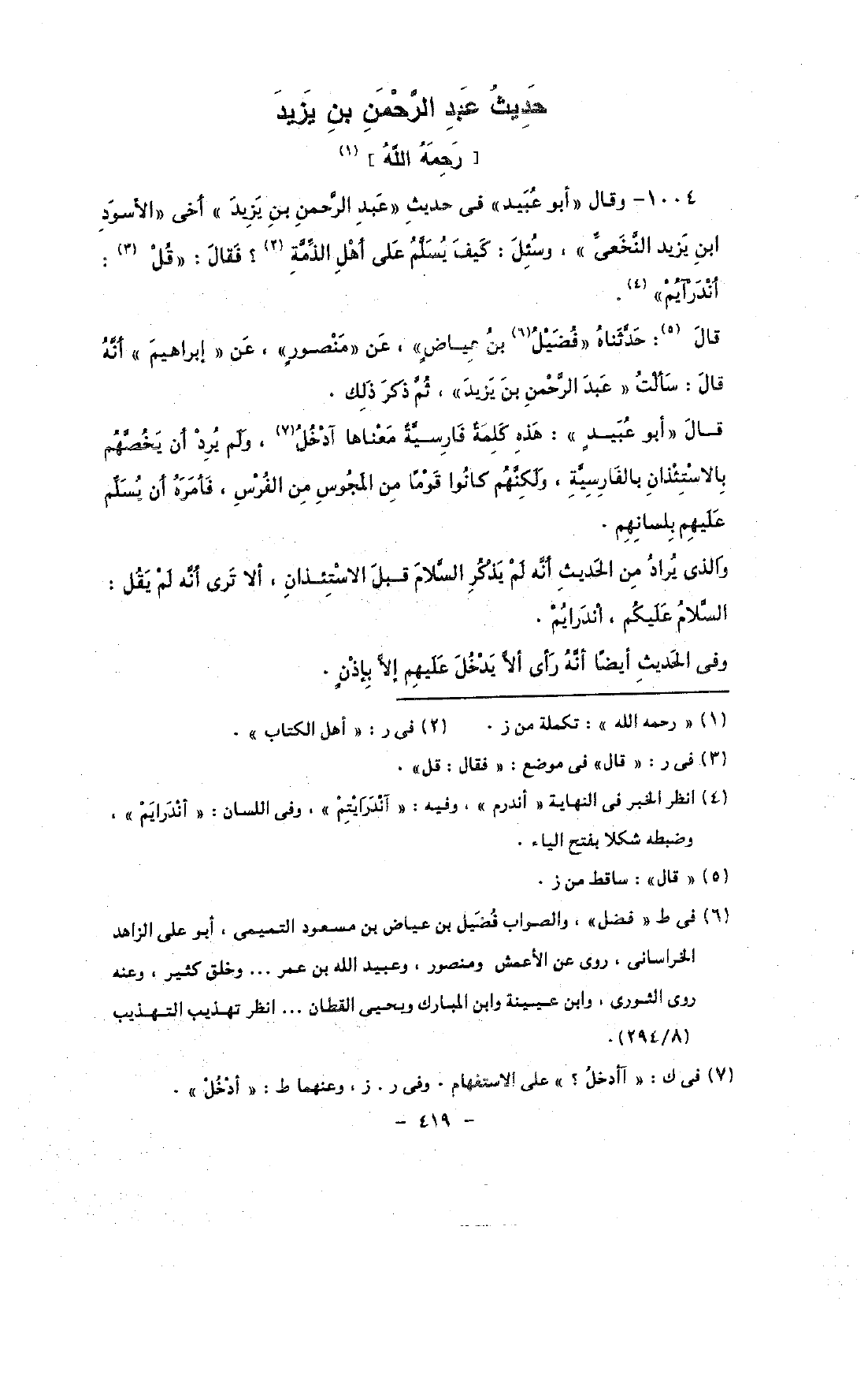 1004 - وقال «أبو عبيد» فى حديث «عبد الرحمن بن يزيد» أخى «الأسود ابن يزيد النخعى» , وسئل: كيف يسلم على أهل الذمة؟ فقال: «قل: انداريم».