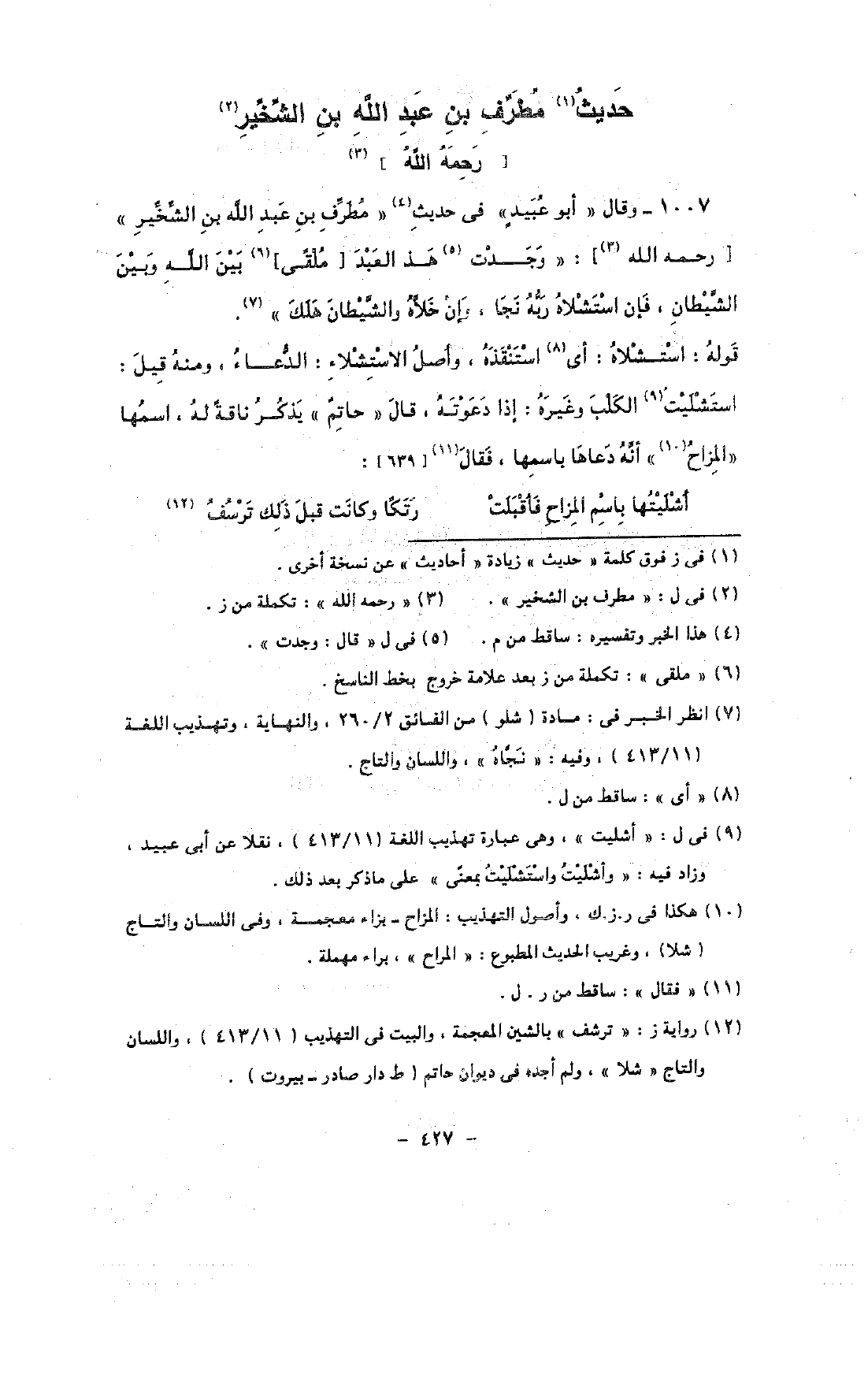 1007 - وقال «أبو عبيد» فى حديث «مطرف بن عبد الله بن الشخير» [رحمه الله]: «وجدت هذ العبد [ملقى] بين الله وبين الشيطان, فإن استشلاه ربه نجا, وإن خلاه والشيطان هلك».