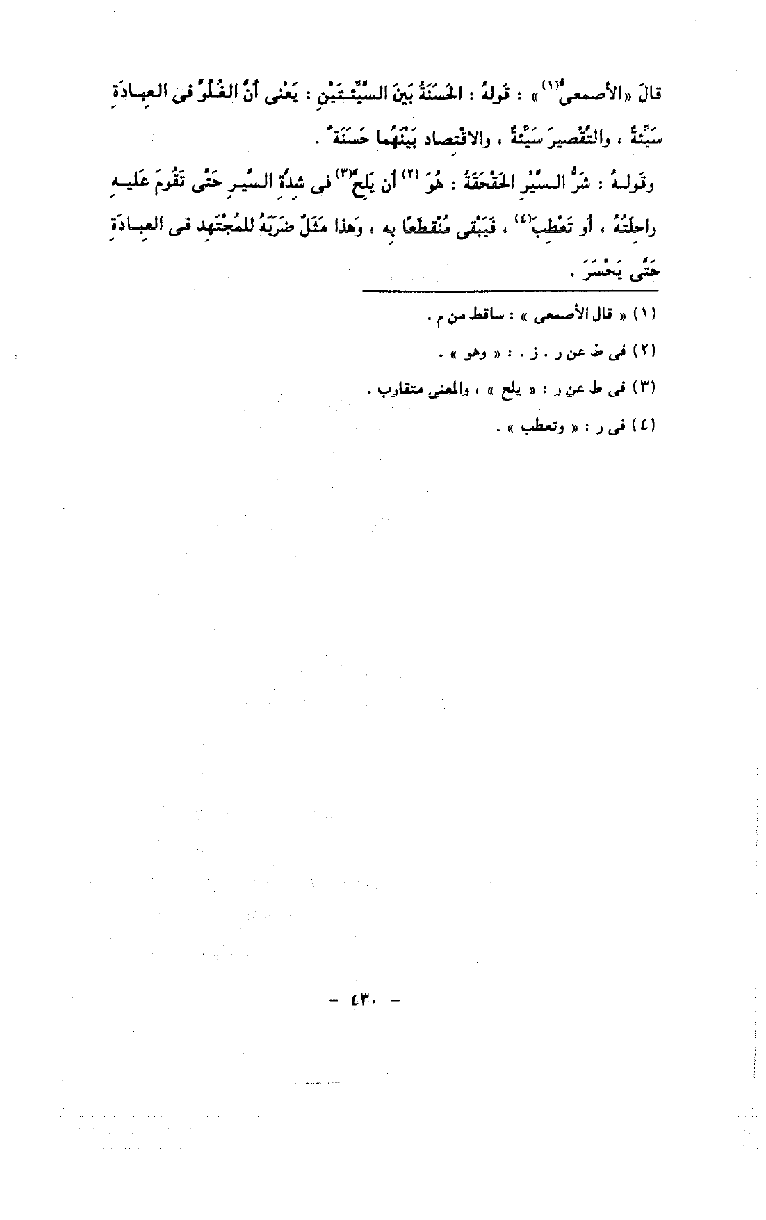 قال «الأصمعى»: قوله: الحسنة بين السيئتين: يعنى أن الغلو فى العبادة سيئة, والتقصير سيئة, والاقتصاد بينهما حسنة.