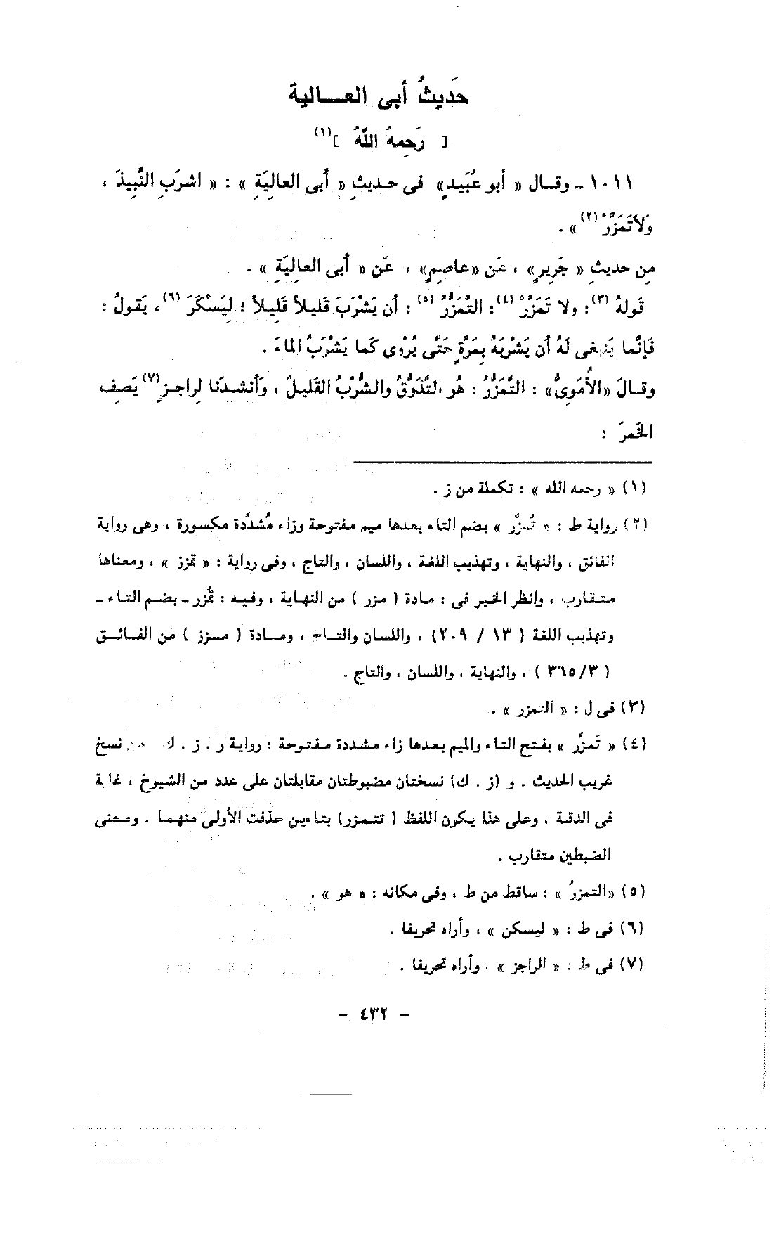 1011 - وقال «أبو عبيد» فى حديث «أبى العالية»: «اشرب النبيذ, ولاتمزر».