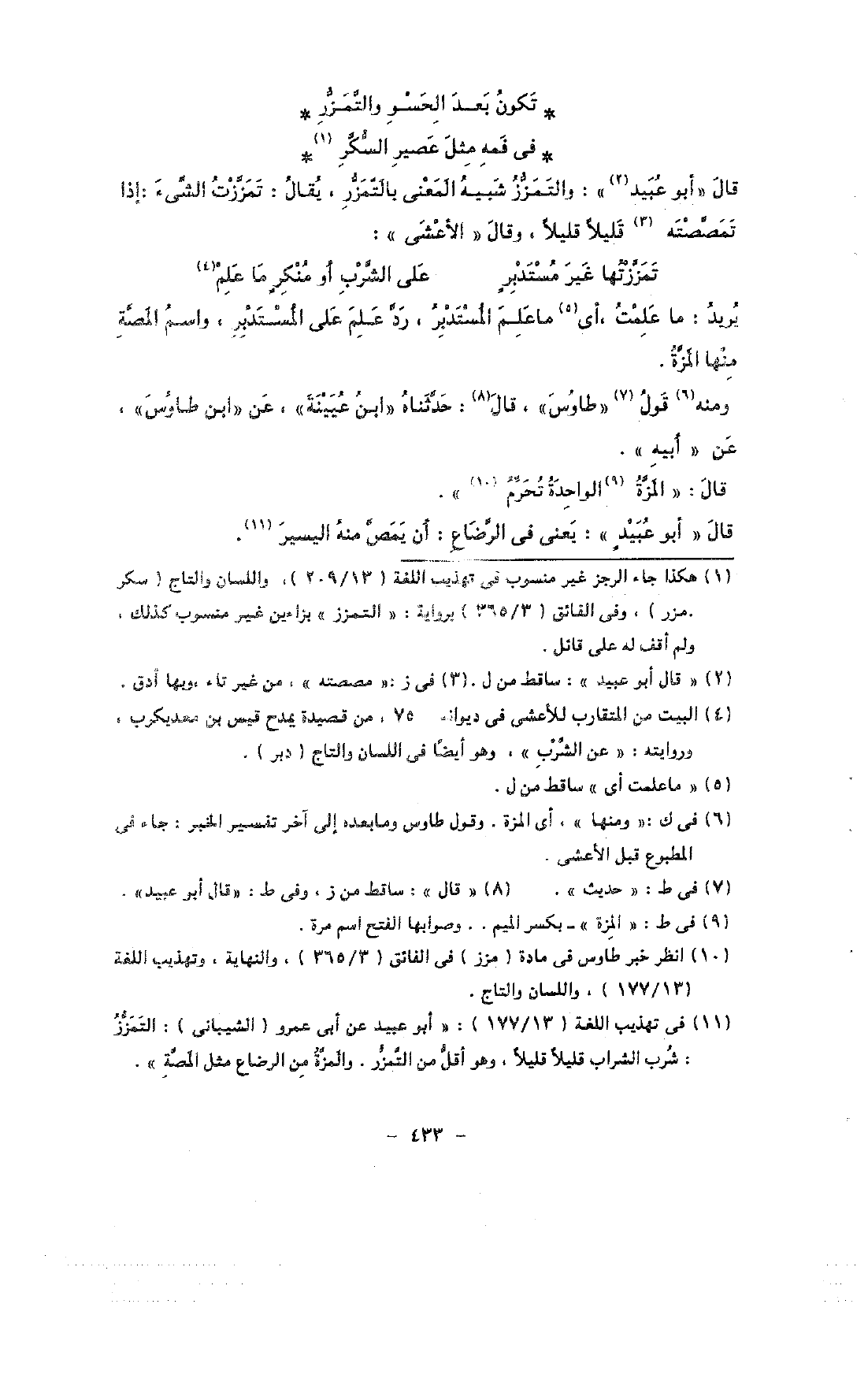 قال «أبو عبيد»: والتمزز شبيه المعنى بالتمزز, يقال: تززت الشئ: إذا تمصصته قليلًا قليلًا, وقال «الأعشى»: